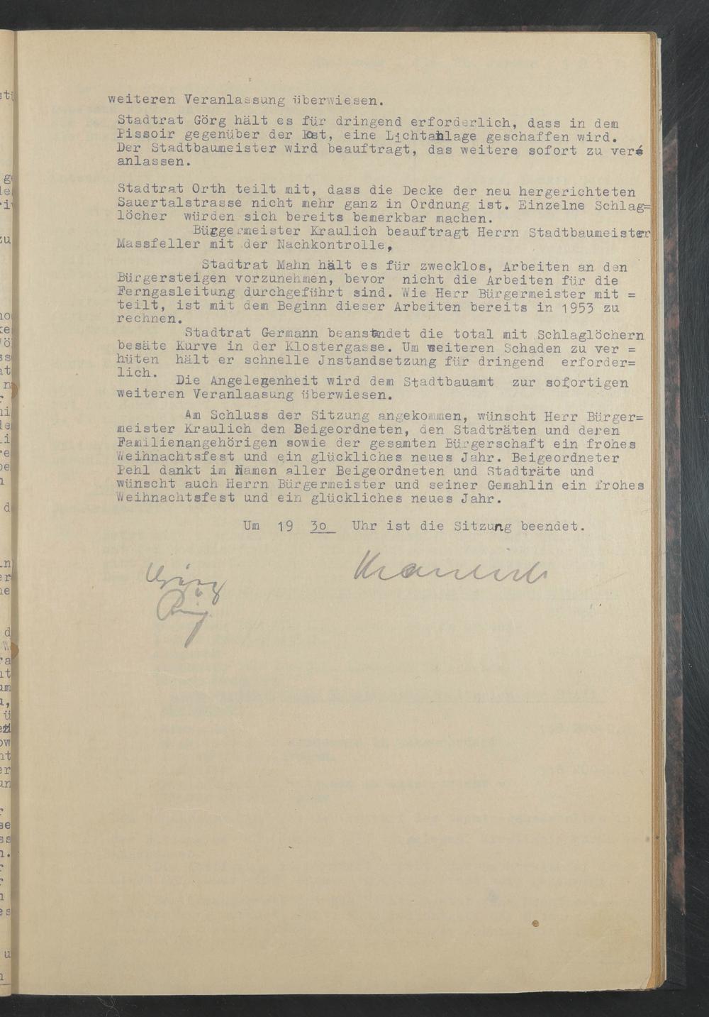 Schluss der Sitzung angekommen, wünscht Herr Bürger= meister Kraulich den Beigeordneten, den Stadträten und deren Familienangehörigen sowie der gesamten Bürgerschaft ein frohes Weihnachtsfest und ein glückliches neues Jahr. Beigeordneter lehl dankt im Namen aller Beigeordneten und Stadträte und wünscht auch Herrn Bürgermeister und seiner Gemahlin ein frohes V^eihnachtsfest und ein glückliches neues Jahr.