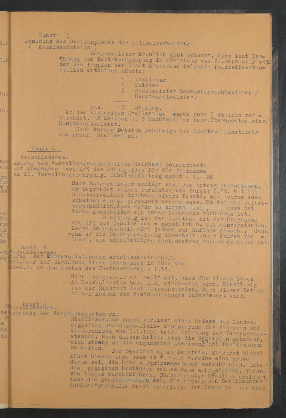 Bürgermeister Kraulich gibt bekannt, dass laut Ver= fügung der Bezirksregierung in Montabaur vom 24.September 19% der Stellenplan der Stadt Montabaur folgende Polizeibeamten= stellen enthalten müsste:
