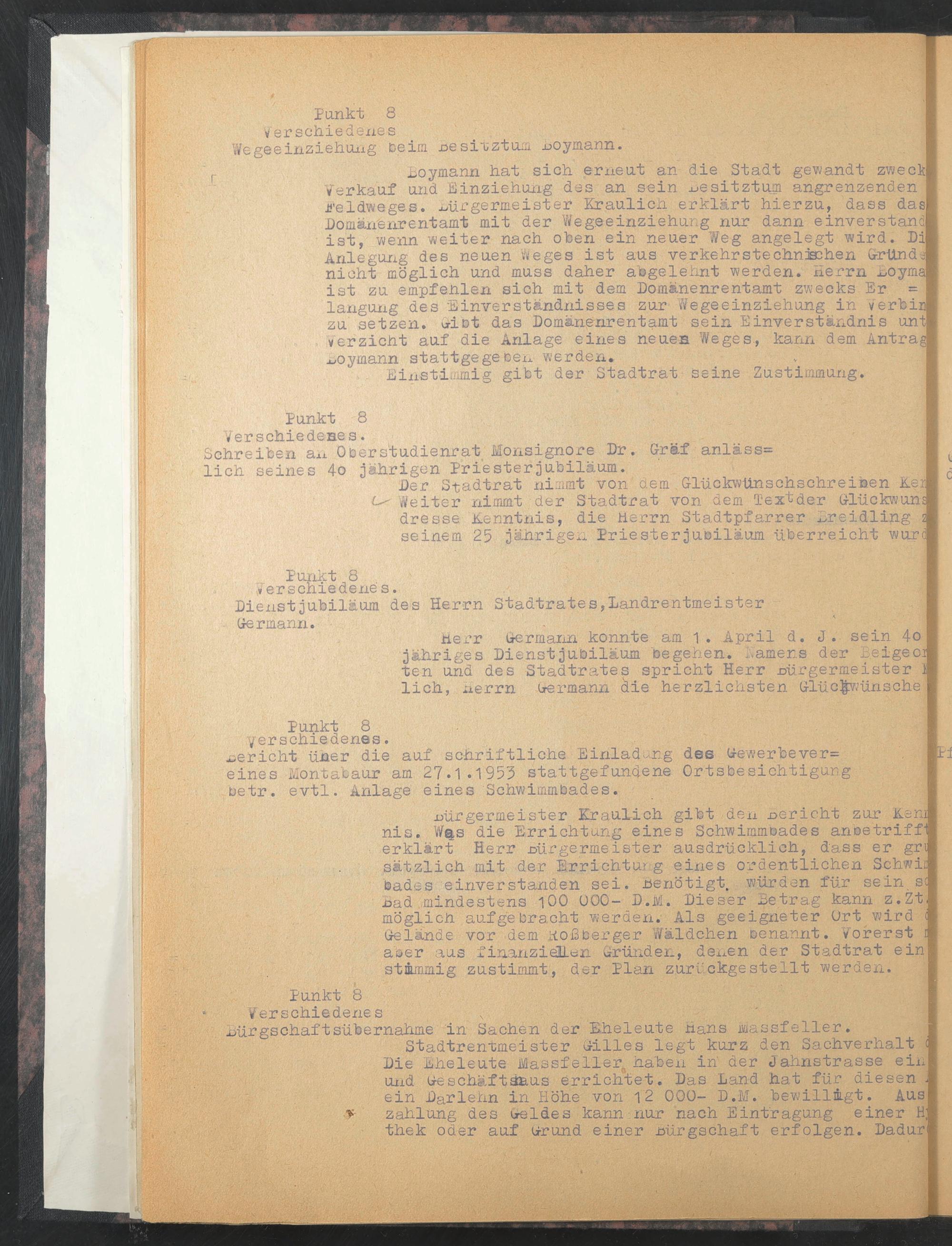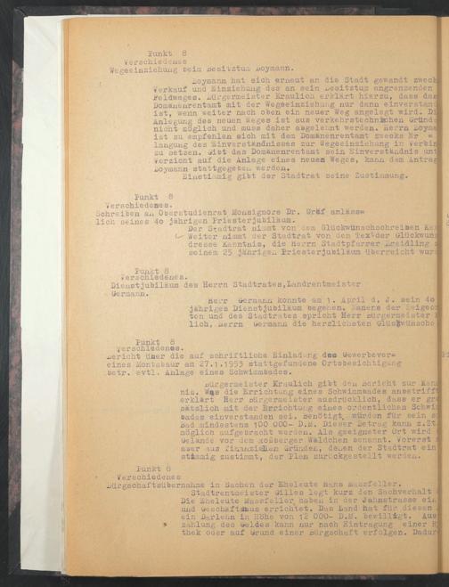 Bürgermeister ErauLich gibt den Bericht zur Ren?! nis. W§,s die Errichtung eines Schwimmbades anoe triff*! ! erklärt Herr Bürgermeister ausdrücklich, dass er gr<; ! sätzlich mit der Errichtung eines ordentlichen Schwia' bades einverstanden sei. Benötigt. würden für sein so, nad mindestens 100 000- D.M. Dieser Betrag kann z.Zt.! möglich aufgebracht werden. Als geeigneter Ort wird ^ Gelände vor dem Roßberger Wäldchen benannt. Vorerst D aoer aus finanzieü-en Gründen, denen der Stadtrat ein st&mmig zustimmt, der Plan zurückgestellt werden.