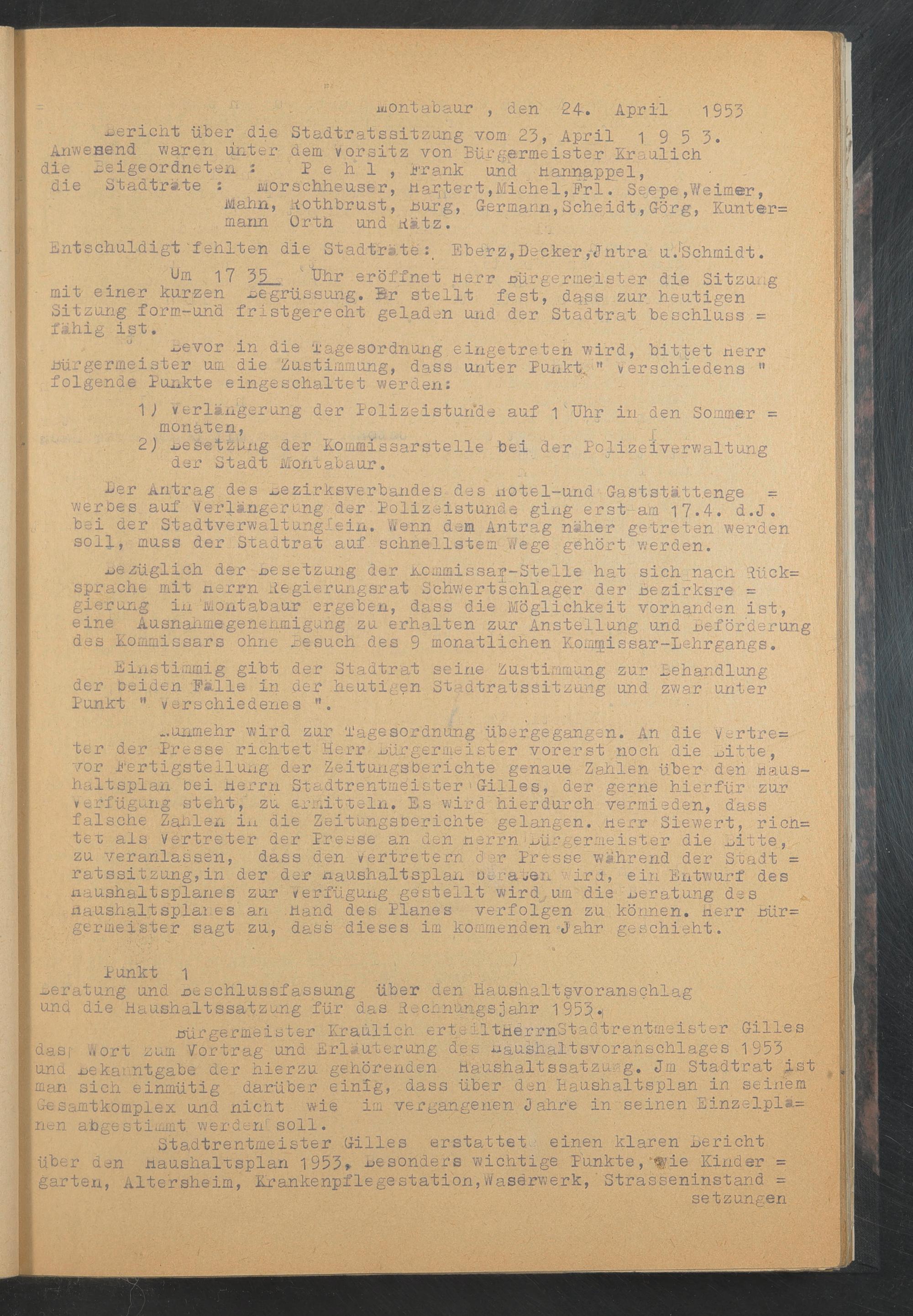 Stadtrentmeister Gilles erstattet einen klaren Bericht über den Haushaltsplan 1953, Besonders wichtige Punkte,^ie Kinder = garten, Altersheim, Krankenpflegestation,w'aserwerk, Strasseninstand =
