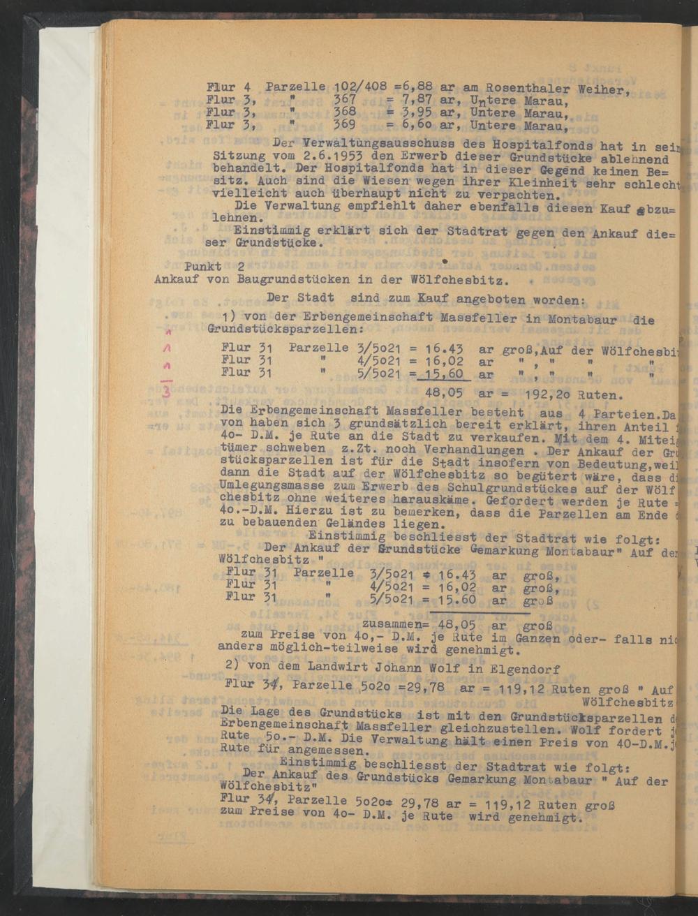 Die Erbengemeinschaft Massfeller besteht aus 4 Parteien.Dal von haben sich 3 grundsätzlich bereit erklärt, ihren Anteil 4o- D.M. je Rute an die Stadt zu verkaufen. Mit dem 4. Miteijj tümer schweben z.Zt. noch Verhandlungen . Der Ankauf der Grti stücksparzellen ist für die Stadt insofern von Bedeutung,weij dann die Stadt auf der Wölfchesbitz so begütert wäre, dass d Umlegungsmasse zum Erwerb des Schulgrundstückes auf der Wölfi chesbitz ohne weiteres harauskäme. Gefordert werden je Rute 4 4o.-D.M. Hierzu ist zu bemerken, dass die Parzellen am Ende zu bebauenden Geländes liegen.