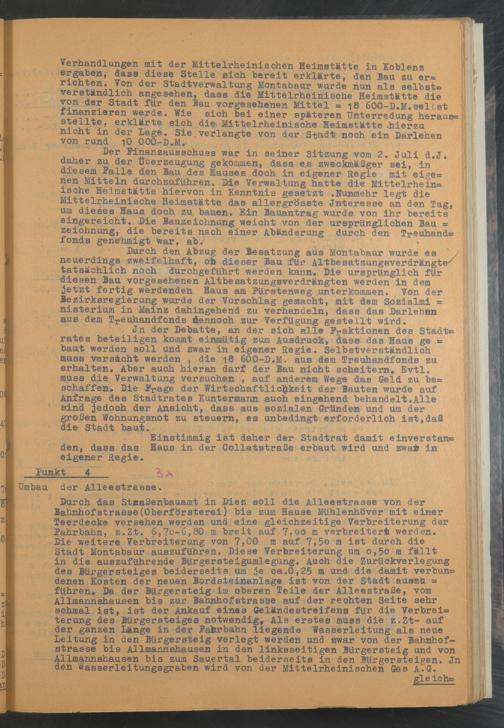 Durch den Abzug der Besatzung aus Montabaur wurde es / neuerdings zweifelhaft, oh dieser Bau für Altbesatzungsverdrängte/ tatsächlich noch durchgeführt werden kann. Die ursprünglich für diesen Bau vorgesehenen Altbesatzungsverdrängten werden in dem jetzt fertig werdenden Haus am Fürstenweg Unterkommen. Von der Bezirksregierung wurde der Vorschlag gemacht, mit dem Spzialmi = nisterium in Mainz dahingehend zu verhandeln, dass das Darlehen aus dem Tpeuhandfonds dennoch zur Verfügung gestellt wird.