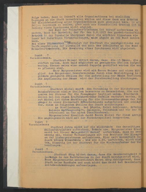 Stadtrat Jntra macht auf die Missstände des derzeitigen Müllanfuhrplatzes aufmerksam, Brände usw. Bürgermeister Kraul] macht bei dieser Gelegenheit darauf aufmerksam, dass es zwec! mässig sei, wieder Verhandlungen mit dem Besitzer der Kiesgru] an der Limburgerstrasse aufzunehmen. Hier weit ausserhalb der] Stadt können Missstände , wie sie z.Zt. auftreten, nicht eint] ten. Einmütig ist der Stadtrat für die Wiederaufnahme der Vei] handl ungen.