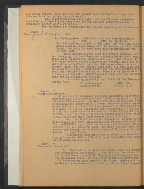 Einstimmig genehmigt der Stadtrat die Bereitste! der geforderten 500 - 600- D.M. auch begrüßter die Schaf] des Volksbildungswerkes.