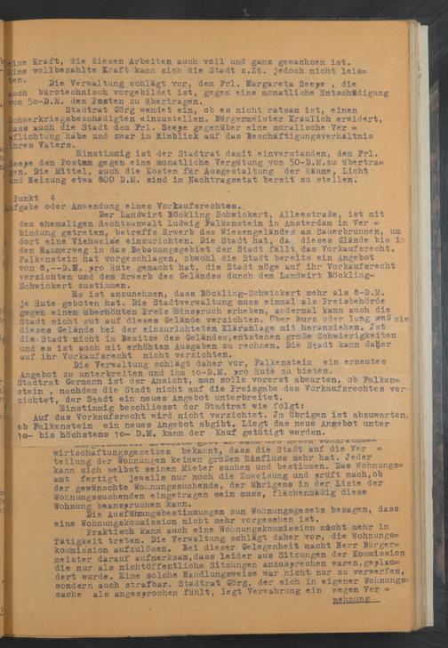 Praktisch kann auch eine Wohnungskommission n&cht mehr in Tätigkeit treten. Die Verwaltung schlägt daher von, die Wohnungs= kommission aufzulösen. Bei dieser Gelegenheit macht Herr Bürger= meister darauf aufmerksam,dass leider aus Sitzungen der Kommission die nur als nichtöffentliche Sitzungen anzusprechen waren,geplau= dert wurde. Eine solche Handlungsweise war nicht nur zu verwerfen, sondern auch strafbar. Stadtrat Görg, der sich in eigener Wohnungs= Sache als angesprochen fühlt, legt Verwahrung ein wegen Ver =