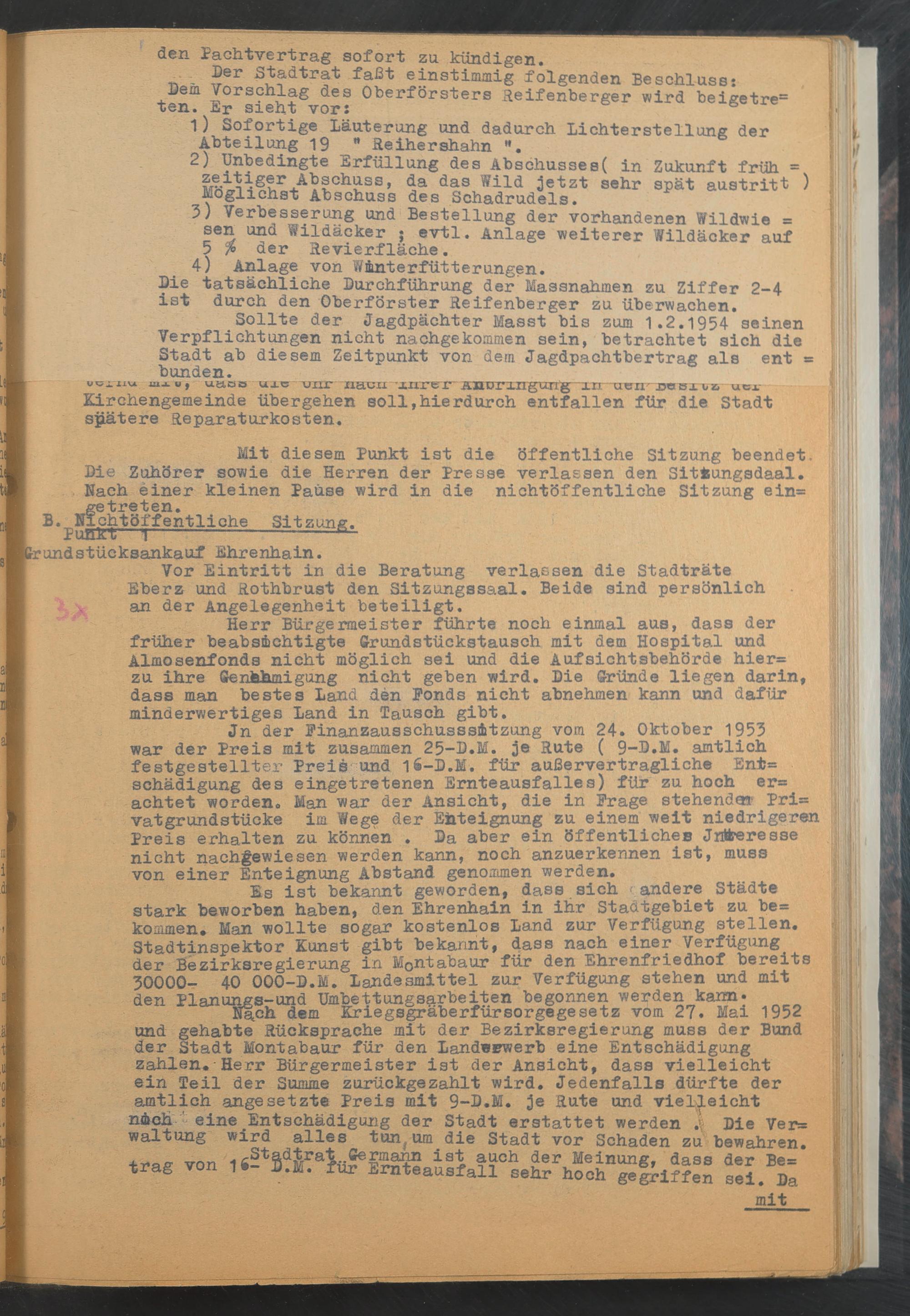 Sollte der Jagdpächter Masst bis zum 1.2.1954 seinen Verpflichtungen nicht nachgekommen sein, betrachtet sich die Stadt ab diesem Zeitpunkt von dem Jagdpachtbertrag als ent = bunden.