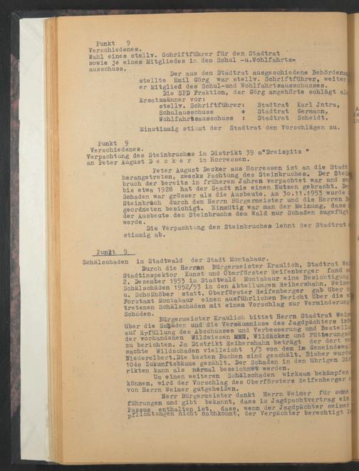 Peter August Decker aus Horressen ist an die Stadt herangetreten, zwecks Pachtung des Steinbruches. Der Steil bruch der bereits in früheren Jahren verpachtet war und zwa bis etwa 1928 hat der Stadt nie einen Nutzen gebracht. De: Schaden war grösser als die Ausbeute. Am 3o.11.1953 wurde i Steinbrech durch den Herrn Bürgermeister und die Herren Bt geordneten besichigt. Einmütig war man der Meinung, dass] der Ausbeute des Steinbruehs dem Wald nur Schaden zugefügt werde.