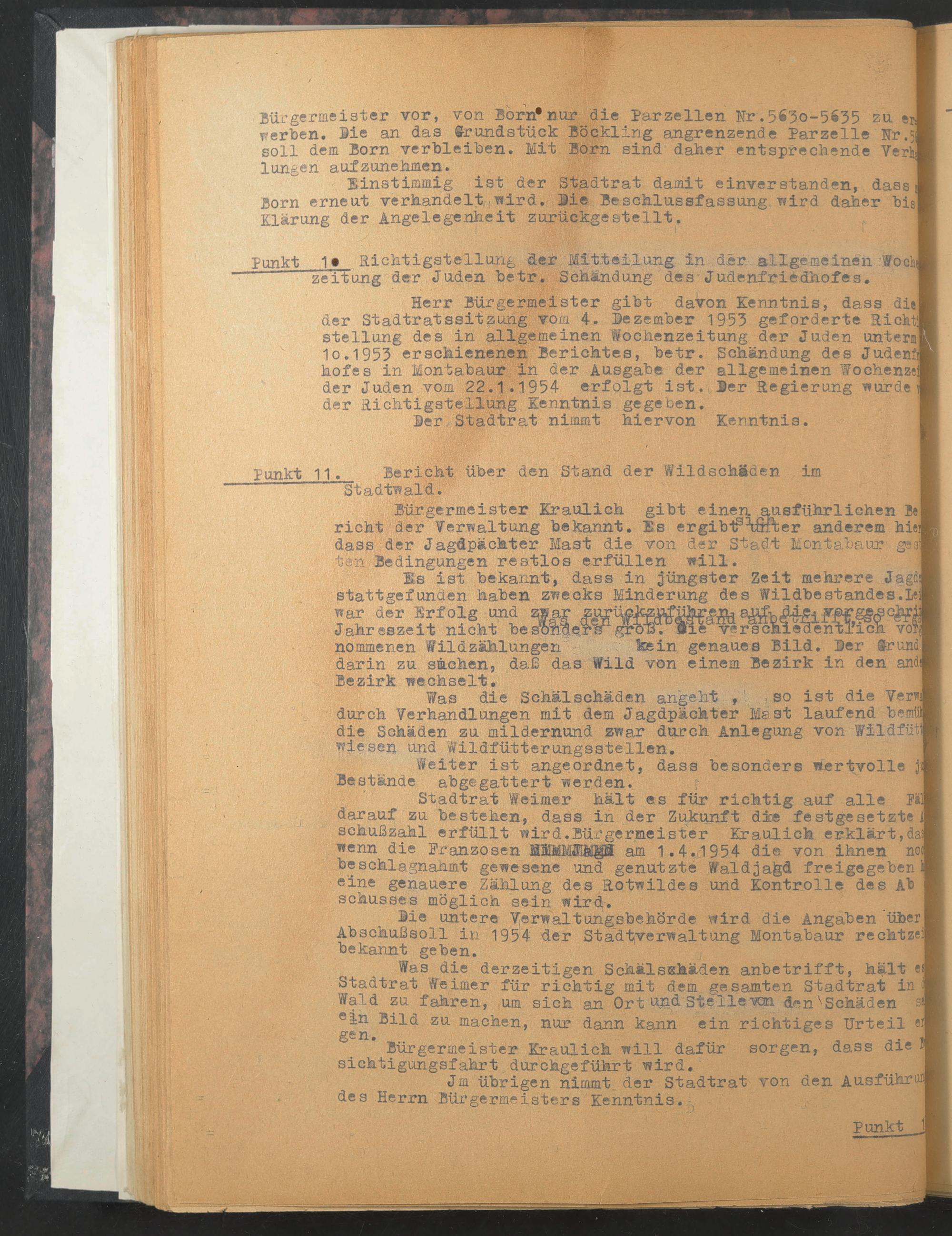 Herr Bürgermeister gibt daton Kenntnis, dass die) der Stadtratssitzung vom 4. Dezember 1953 geforderte RicM Stellung des in allgemeinen Wochenzeitung der Juden unterm] 1 o.1953 erschienenen Berichtes, betr. Schändung des Judenfj hofes in Montabaur in der Ausgabe der der Juden vom 22.1.1954 erfolgt ist., der Richtigstellung Kenntnis gegeben.