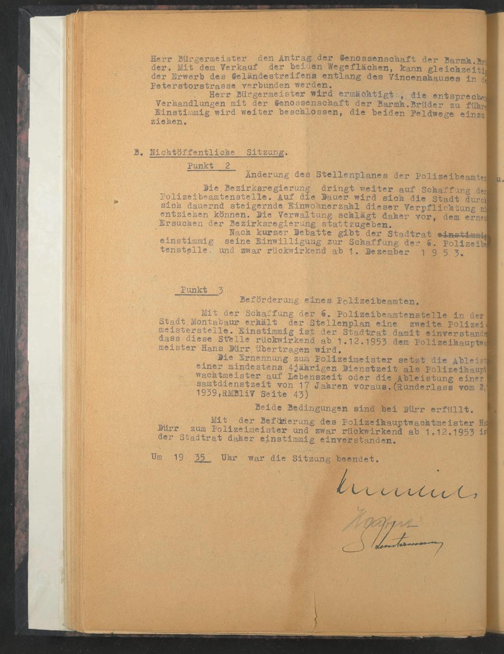 Mit der Schaffung der 6. Polizeibeamtenstelle in der Stadt Montabaur erhält der Stellenplan eine zweite Polizei meisterstelle.'Einstimmig ist der Stadtrat damit e inverstand! dass diese Sthlle rückwirkend ab 1.12.1953 dem Polizeihauptwa] meister Hans Bürr übertragen wird.