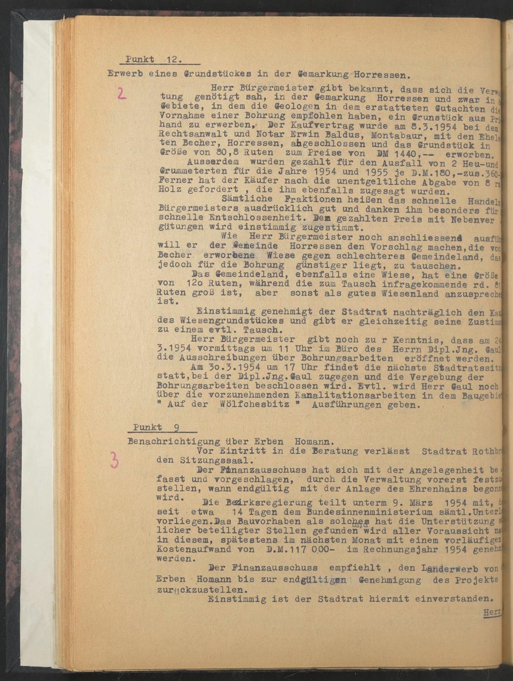 Wie Herr Bürgermeister noch anschliessend ausfR will er der Gemeinde Horressen den Vorschlag machen,die von! Becher erworbene Wiese gegen schlechteres Gemeindeland, das jedoch für die Bohrung günstiger liegt, zu tauschen.
