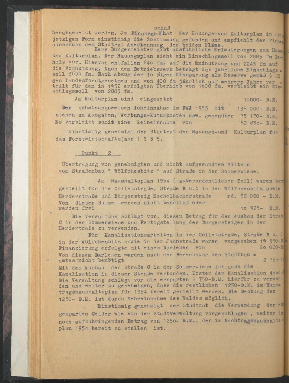 Einstimmig genehmigt der Stadtrat den Hauungs-und Kulturplan für das Forstwirtschaftsjahr 1955.