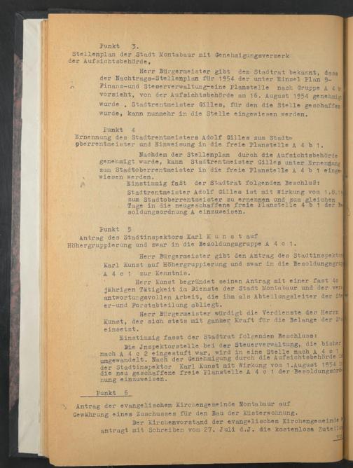 Herr Bürgermeister gibt dem Stadtrat bekannt, dass der Nachtrags-Stellenplan für 1954 der unter Einzel plan 9 - Finanz—und Stenerverwaltung**eine Planstelle nach Gruppe A 4 h! vorsieht, von der Aufsichtsbehörde am 16 . August 1954 genehmigt! wurde . Stadtrentmeister Gilles, für den die Stelle geschaffen wurde, kann nunmehr in die Stelle eingewiesen werden.