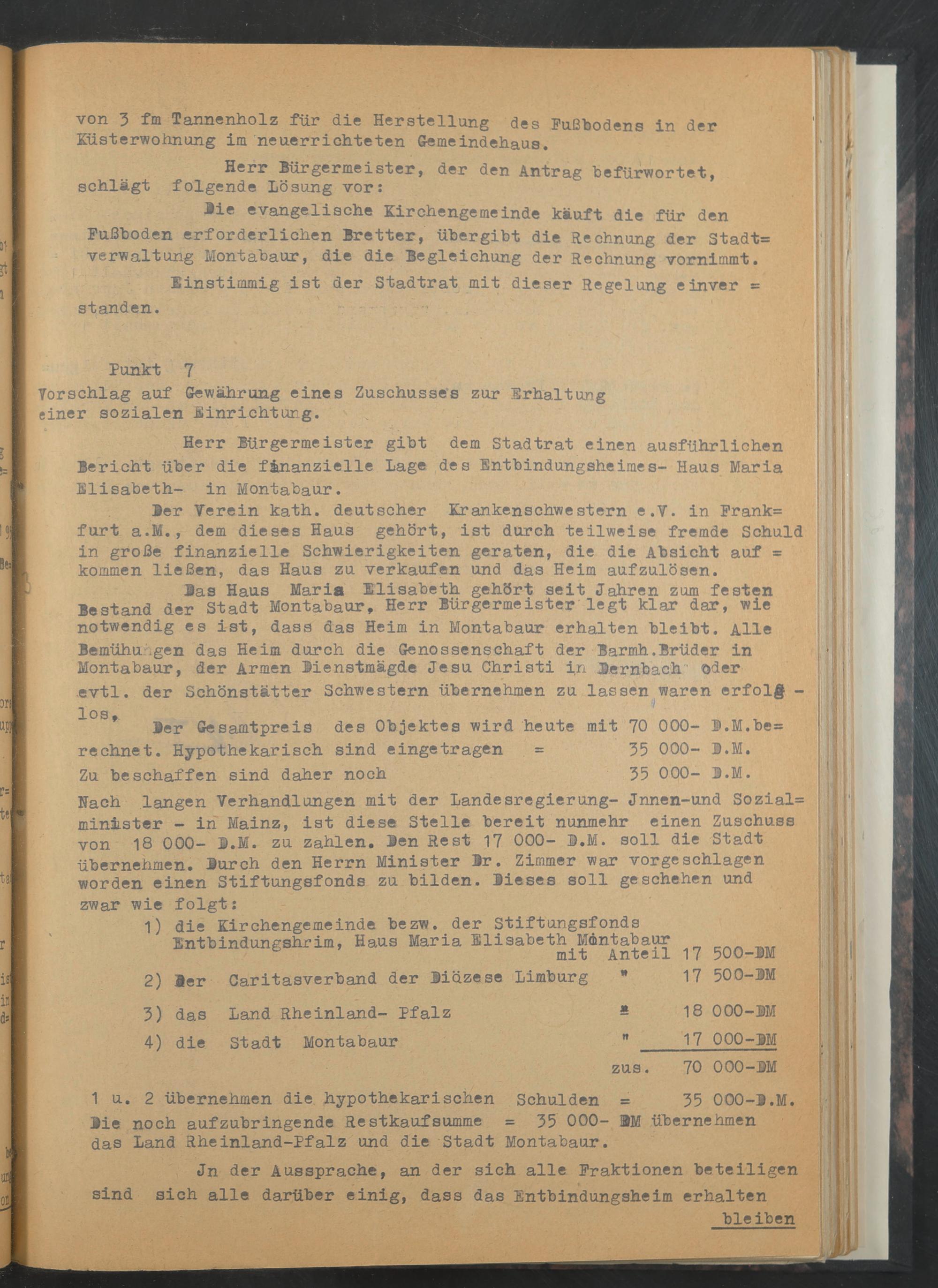 Herr Bürgermeister gibt dem Stadtrat einen ausführlichen Bericht über die finanzielle Lage des Entbindungsheimes- Haus Maria Elisabeth- in Montabaur.