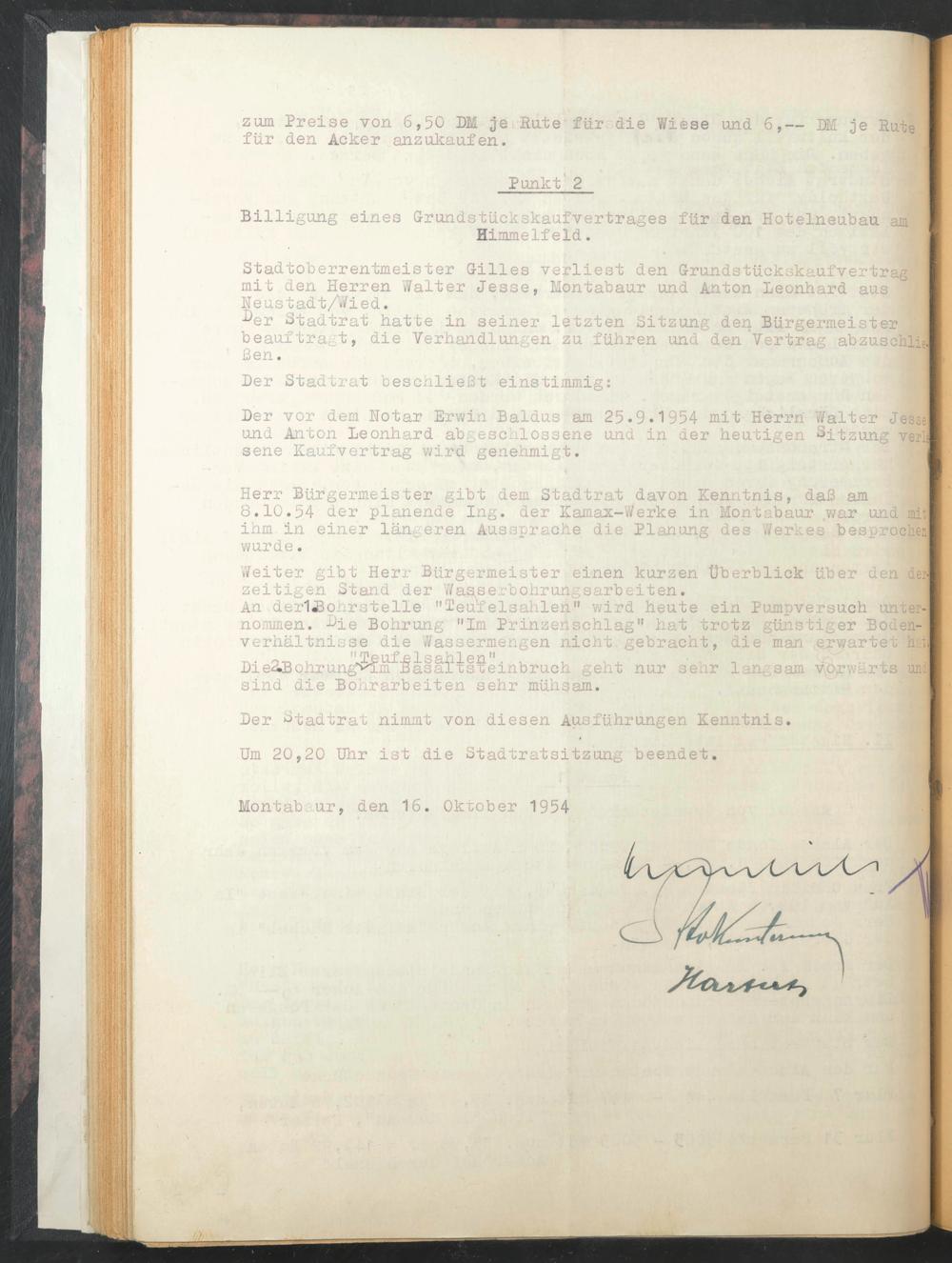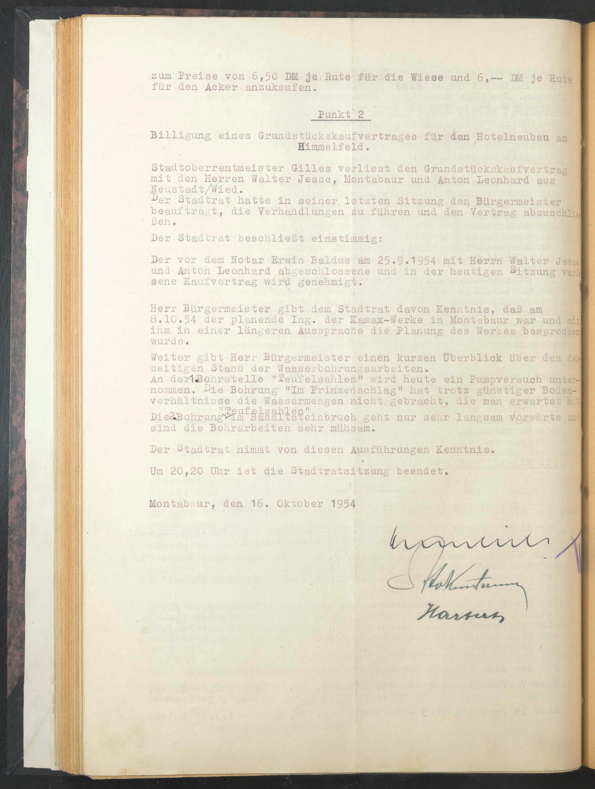 Der vor dem Notar Erwin Baldus am 25.9*1954 mit Herrn Walter Jesse und Anton Leonhard abgeschlossene und in der heutigen Sitzung verL sene Kaufvertrag wird genehmigt. j