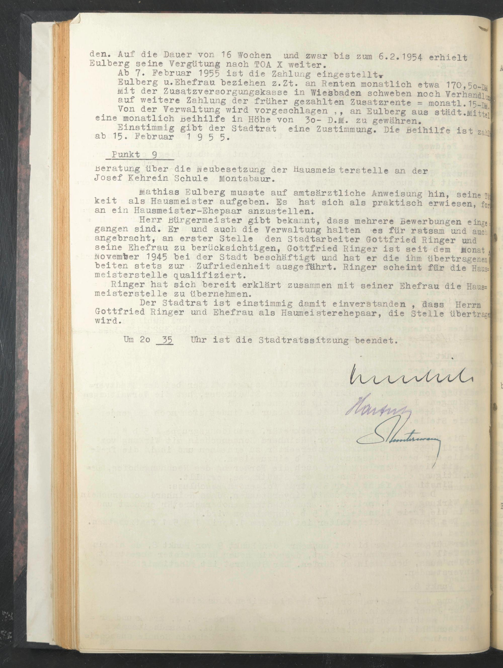 Herr Bürgermeister gibt bekannt, dass mehrere Bewerbungen eing{ gangen sind. Er und auch die Verwaltung halten -es für ratsam und au<n angebracht, an erster Stelle den Stadtarbeiter Gottfried Ringer und seine Ehefrau zu berücksichtigen, Gottfried Ringer ist seit dem nonat November 1945 bei der Stadt beschäftigt und hat er die ihm übertragenen beiten stets zur Zufriedenheit ausgefährt. Ringer scheint für die Hatia meisterstelle qualifiziert.