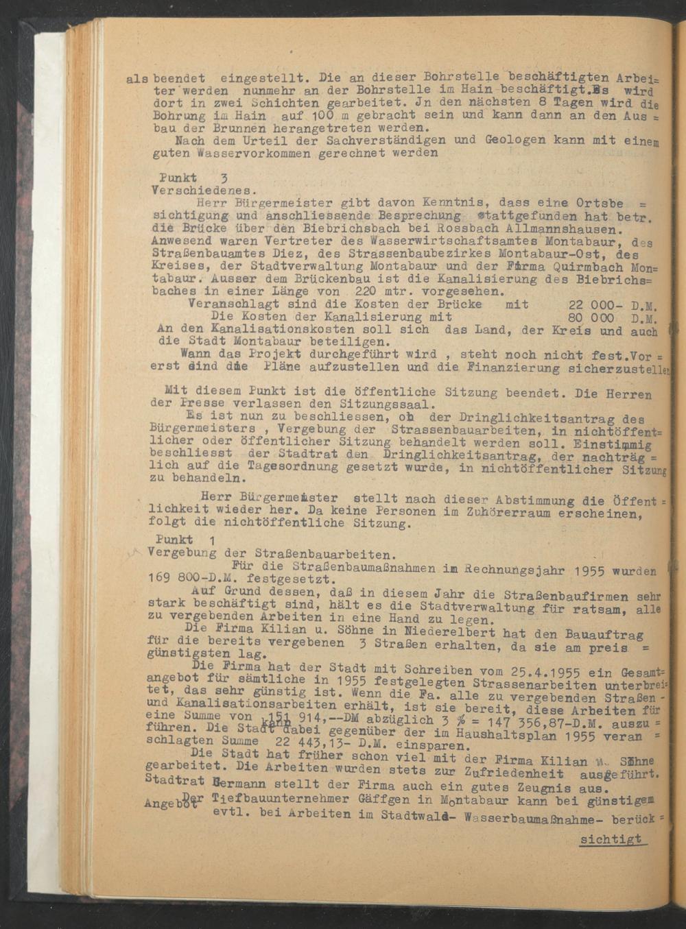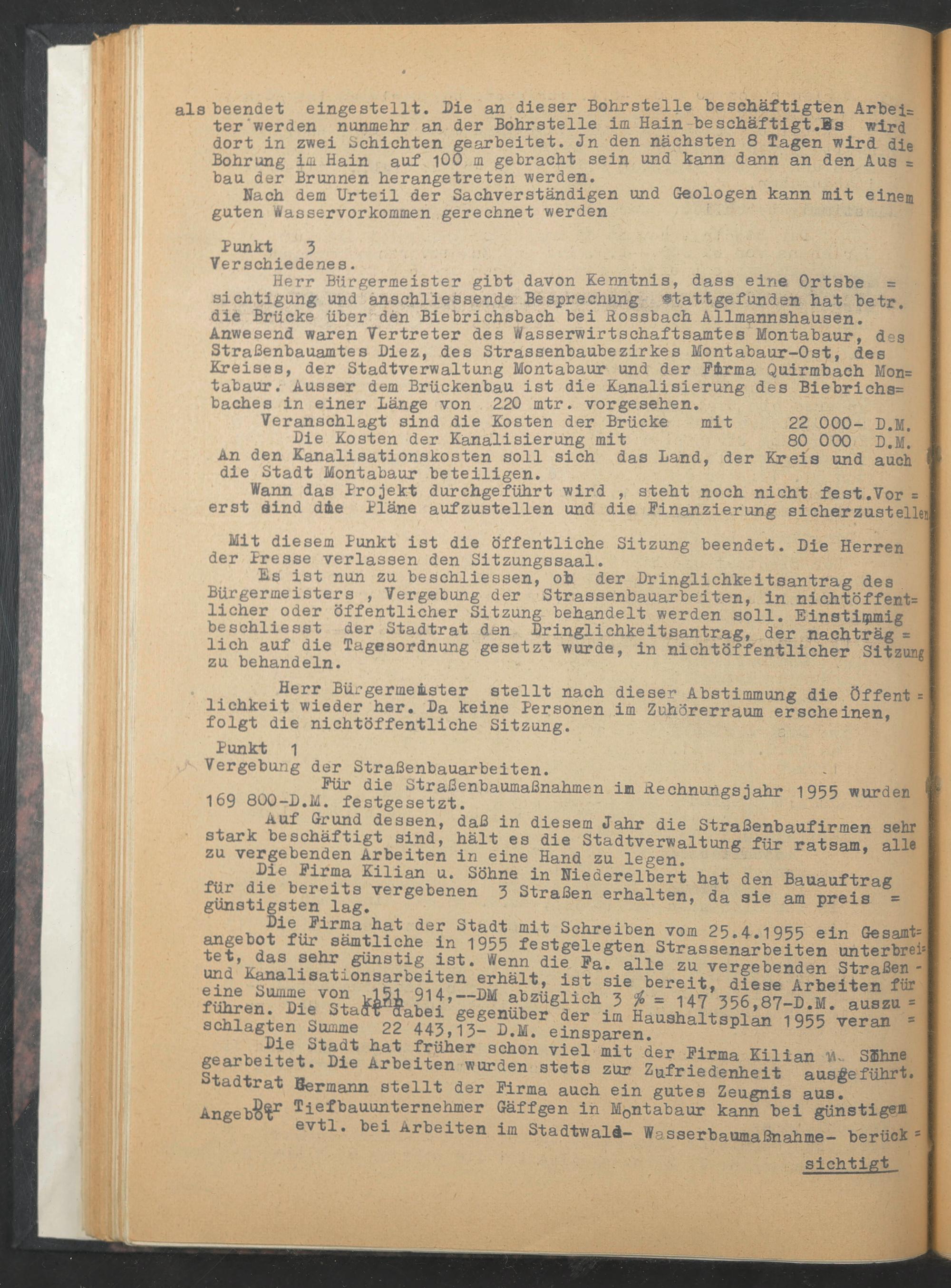 Herr Bürgermeister gibt davon Kenntnis, dass eine Ortsbe = sichtigung und anschliessende Besprechung atattgefunden hat betr. die Brücke über den Biebrichsbach bei Rossbach Allmannshausen. Anwesend waren Vertreter des Wasserwirtschaftsamtes Montabaur, des Straßenbauamtes Diez, des Strassenbaubezirkes Montabaur-Ost, des Kreises, der Stadtverwaltung Montabaur und der Firma Quirmbach Mon= tabaur. Ausser dem Brückenbau ist die Kanalisierung des Biebrichs= baches in einer Länge von 2,20 mtr. vorgesehen.
