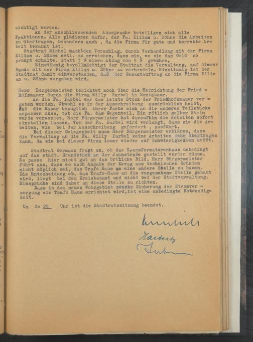 An der anschliessenden Aussprache beteiligen sich alle Fraktionen. Alle plädieren dafür, der Fa. Kiliam u. Söhne die Arbeiten zu. übertragen, besonders auch , da die Firma für gute und korrekte Ar= beit bekannt ist.
