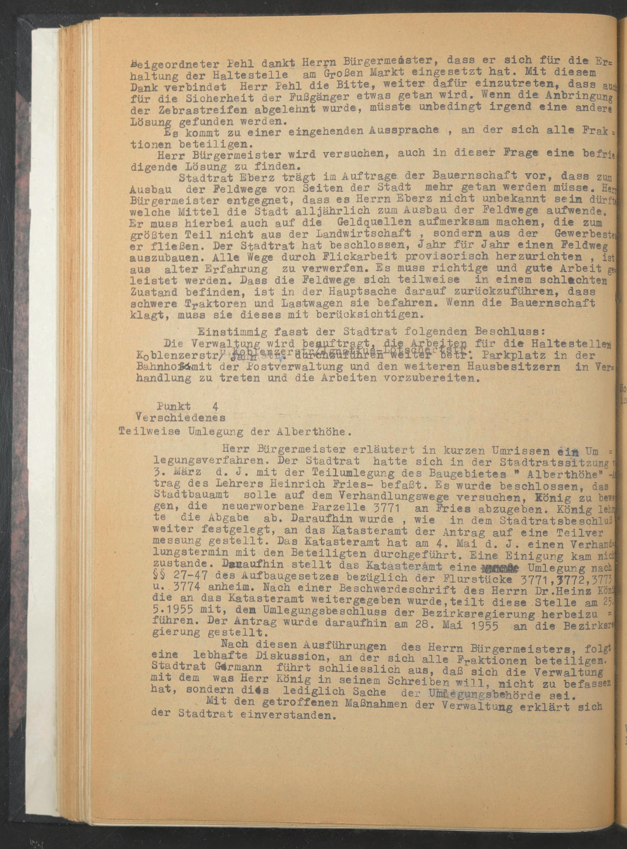Stadtrat Eberz trägt im Aufträge der Bauernschaft vor, dass zum Ausbau der Feldwege von Seiten der Stadt mehr getan werden müsse. Hey Bürgermeister entgegnet, dass es Herrn Eberz nicht unbekannt sein dürft welche Mittel die Stadt alljährlich zum Ausbau der Feldwege aufwende. Er muss hierbei auch auf die Geldquellen aufmerksam machen, die zum größten Teil nicht aus der Landwirtschaft , sondern aus der Gewerbes^] er fließen. Der Stadtrat hat beschlossen, Jahr für Jahr einen Feldweg ] auszubauen. Alle Wege durch Flickarbeit provisorisch herzurichten , ist] aus alter Erfahrung zu verwerfen. Es muss richtige und gute Arbeit g leistet werden. Dass die Feldwege sich teilweise in einem schlechten Zustand befinden, ist in der Hauptsache darauf zurückzuführen, dass schwere Traktoren und Lastwagen sie befahren. Wenn die Bauernschaft klagt, muss sie dieses mit berücksichtigen.