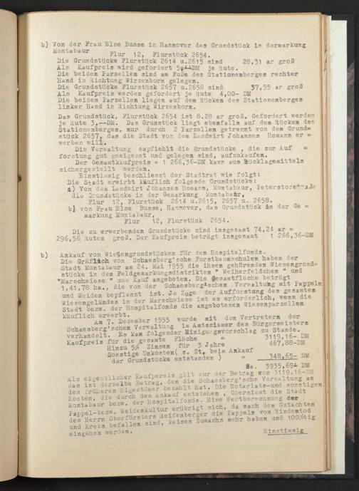 Das Grundstück, Flurstück 2654 ist 8.28 ar groß. Gefordert werden je Rute 3,—DM. Das Grunstück liegt ebenfalls auf den Rücken des Stationenberges, nur durch 2 Parzellen getrennt von den Grund= stück 2657, das die Stadt von den Landwirt Johannes Honann er = werben will.