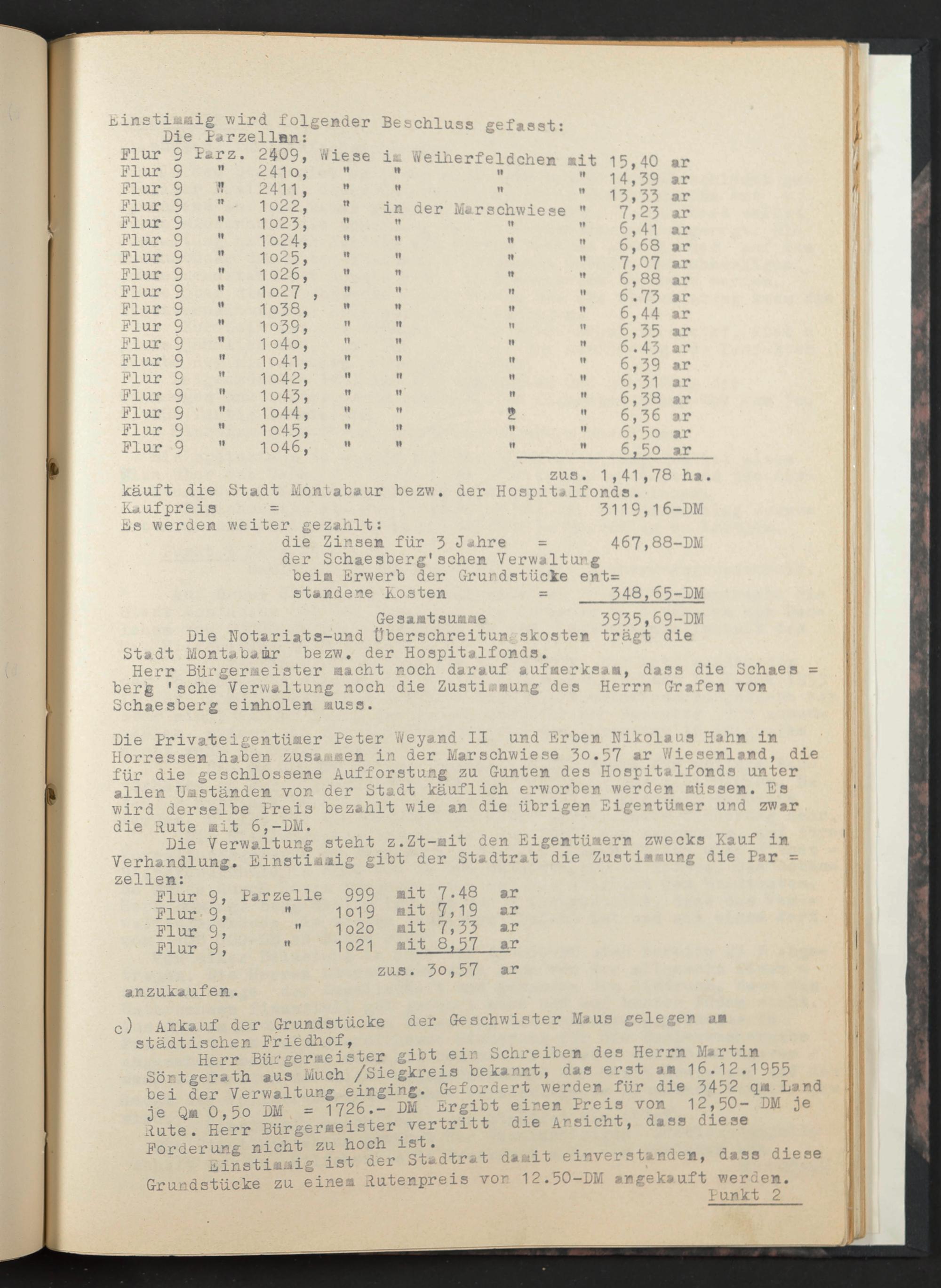 Die Privateigentümer Peter Ys/eyand II und Erben Nikolaus Hahn in Horressen haben zusammen in der Marschwiese 3o.57 ar Wiesenland, die für die geschlossene Aufforstung zu Gunten des Hospitalfonds unter allen Umständen von der Stadt käuflich erworben werden müssen. Es wird derselbe Preis bezahlt wie an die übrigen Eigentümer und zwar die Rute mit 6,-DM.