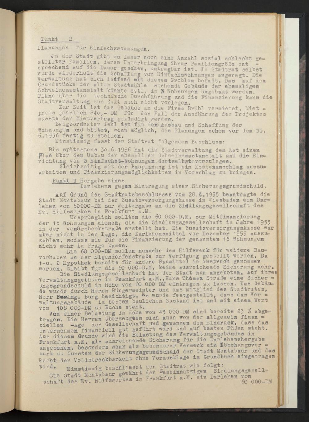 Die Siedlungsgesellschaft hat der Stadt nun angeboten, auf ihret Verwaltungsgebäude in Frankfurt a.M.,Hans Thomas. Straße eine Sicher = urgsgrundschuld in Höhe von 60 000 DM eintragen zu lassen. Das Gebäu= de wurde durch Herrn Bürgermeister und das Mitglied des Stadtrates, Herr Boecing. Burg besichtigt. Es wurde festgestellt, dass das Ver = waltungsgebäude im besten baulichen Zustand ist und mit einem Wert von 108 000-DM zu Buche steht.