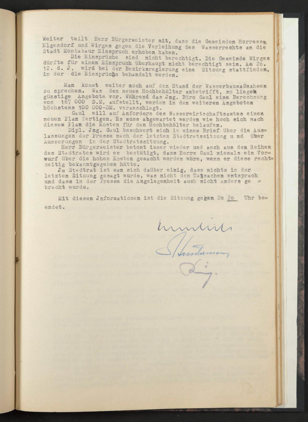 Man. kommt weiter noch auf den Stand der Wasserbaunaßnahmen zu sprechen. Was den neuen Hochbehälter anbetrifft, so lieget günstige Angebote vor. Während das Jng. Büro Gaul eine Berechnung von 167 000 D.M, auf stellt, werden in den weiteren Angeboten höchstens 100 000-DM. veranschlagt.
