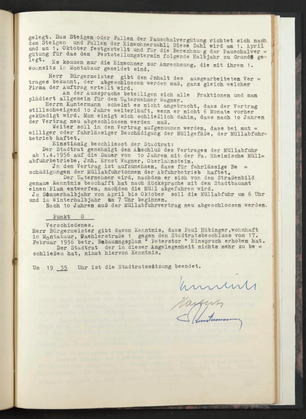 Der Stadtrat genehmigt den Abschluß des Vertrages der Müllabfuhr ab 1.4.1956 auf die Dauer von 1o Jahren mit der Fa. Rheinische Müll= abfuhrbetriebe, Jnh. Ernst Wagner, Oberlahnstein.