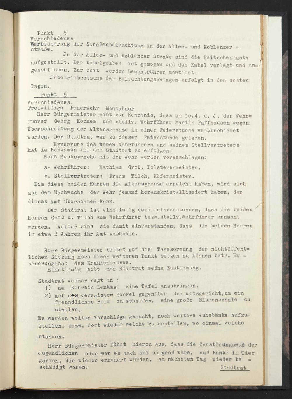 Der Stadtrat ist einstimmig damit teinverstanden, dass die beiden ^ Herren Groß u. Tilch zum Wehrführer bezw.stellv.Wehrführer ernannt