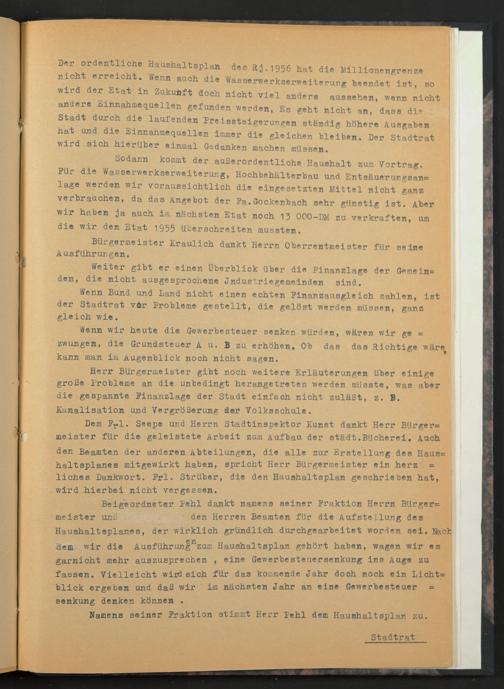 Für die Wasserwerkserweiterung, Hochbehälterbau und Entsäuerungsan= läge werden wir voraussichtlich die eingesetzten Mittel nicht ganz verbrauchen, da das Angebot der Fa.Gockenbach sehr günstig ist. Aber wir haben ja auch im nächsten Etat noch 13 000-DM zu verkraften, um die wir den Etat 1955 überschreiten mussten.