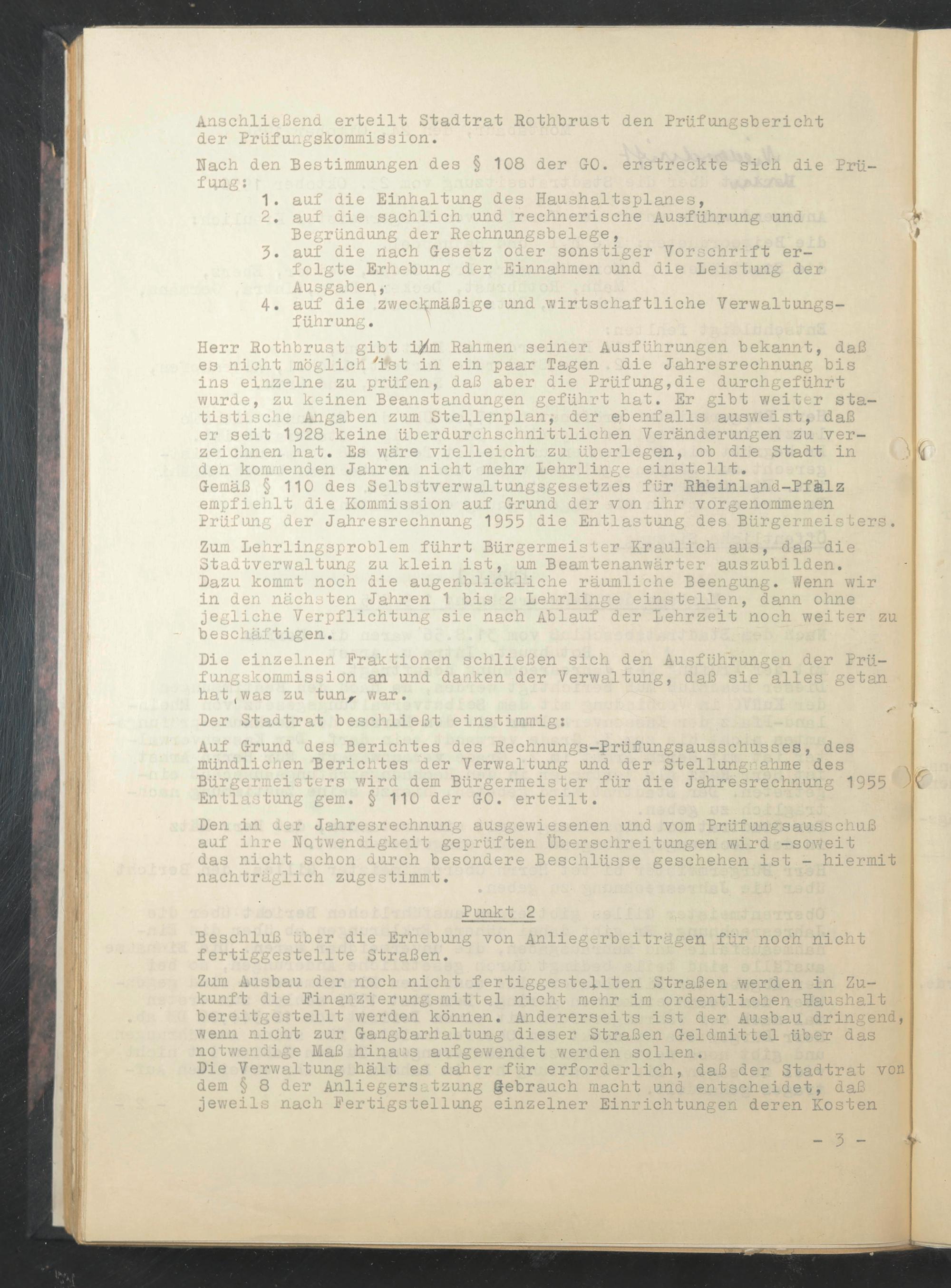 Gemäß § 110 des Selbstverwaltungsgesetzes für Rheinland-Pfälz empfiehlt die Kommission auf Grund der von ihr vorgenommenen Prüfung der Jahresrechnung 1955 die Entlastung des Bürgermeisters.