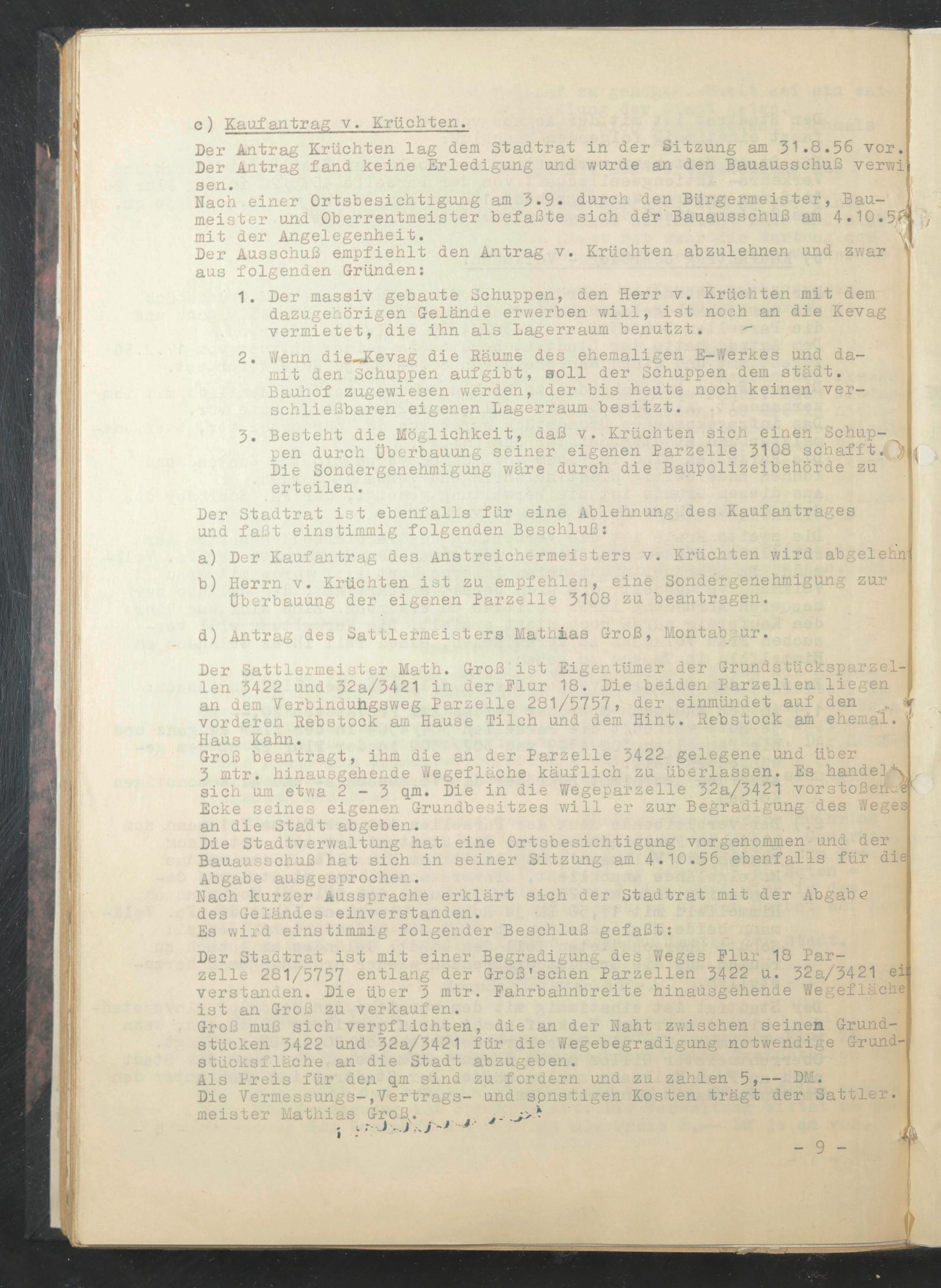Der Antrag Kruchten lag dem Stadtrat in der Sitzung am 31.8.56 vor. Der Antrag fand keine Erledigung und wurde an den Bauausschuß verwi sen.