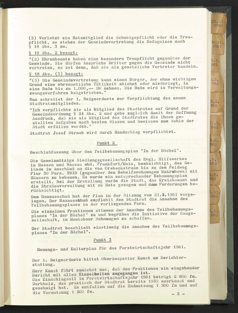 Das Einschlagsoll im Forstwirtschaftsjahr 1961 beträgt 2 800 fm. Derbholz, das praktisch der Stadtrat bereits 1959 anerkannt und genehmigt hat. Es entfallen auf die Endnutzung 1 500 fm und auf