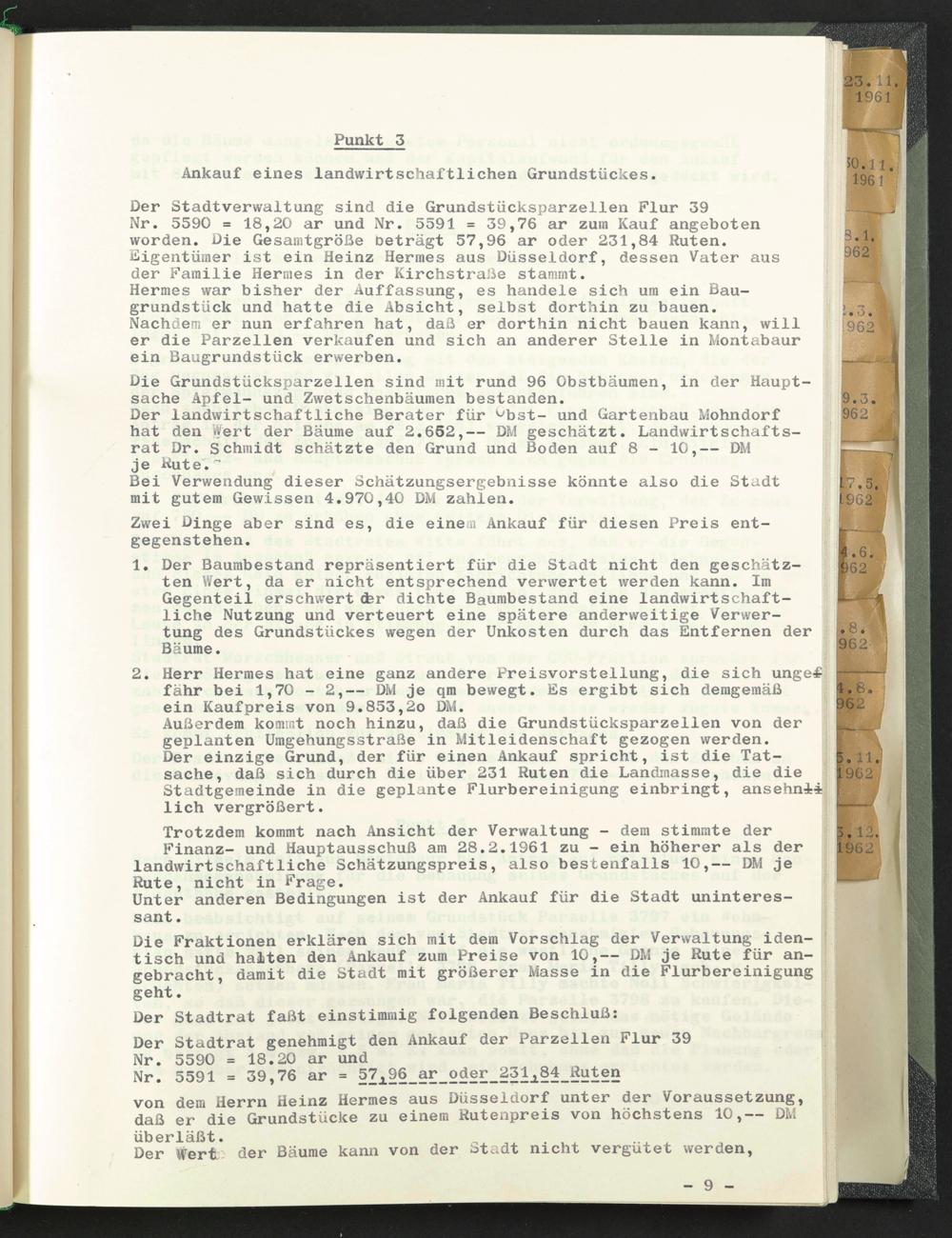 Der Stadtverwaltung sind die Grundstücksparzellen Flur 39 Nr. 5590 = 18,20 ar und Nr. 5591 = 39,76 ar zum Kauf angeboten worden. Die Gesamtgröße Beträgt 57,96 ar oder 231,84 Ruten. Eigentümer ist ein Heinz Hermes aus Düsseldorf, dessen Vater aus der Familie Hermes in der Kirchstraße stammt.