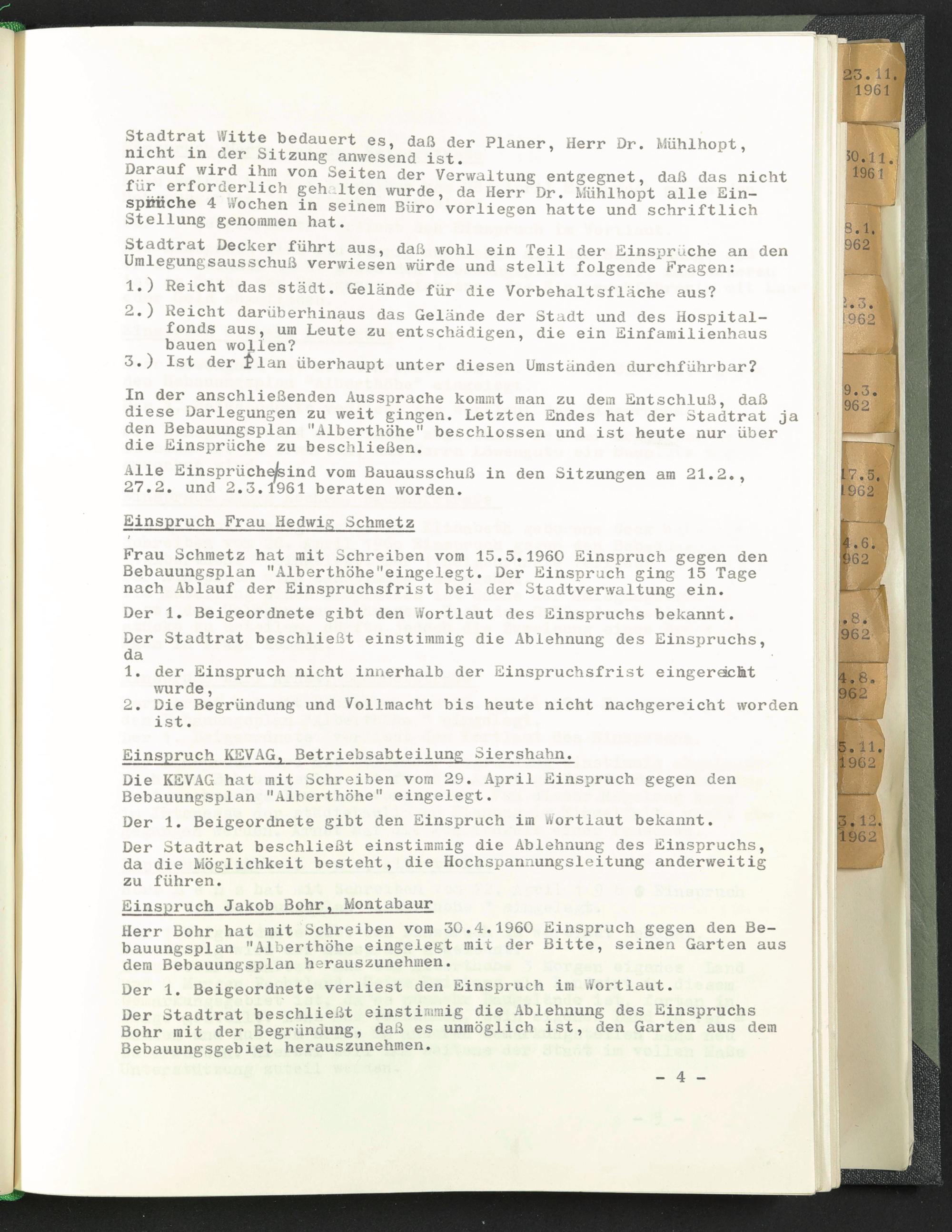 Herr Bohr hat mit Schreiben vom 30.4.1960 Einspruch gegen den Bebauungsplan "Alberthöhe eingelegt mit der Bitte, seinen Garten aus dem Bebauungsplan herauszunehmen.