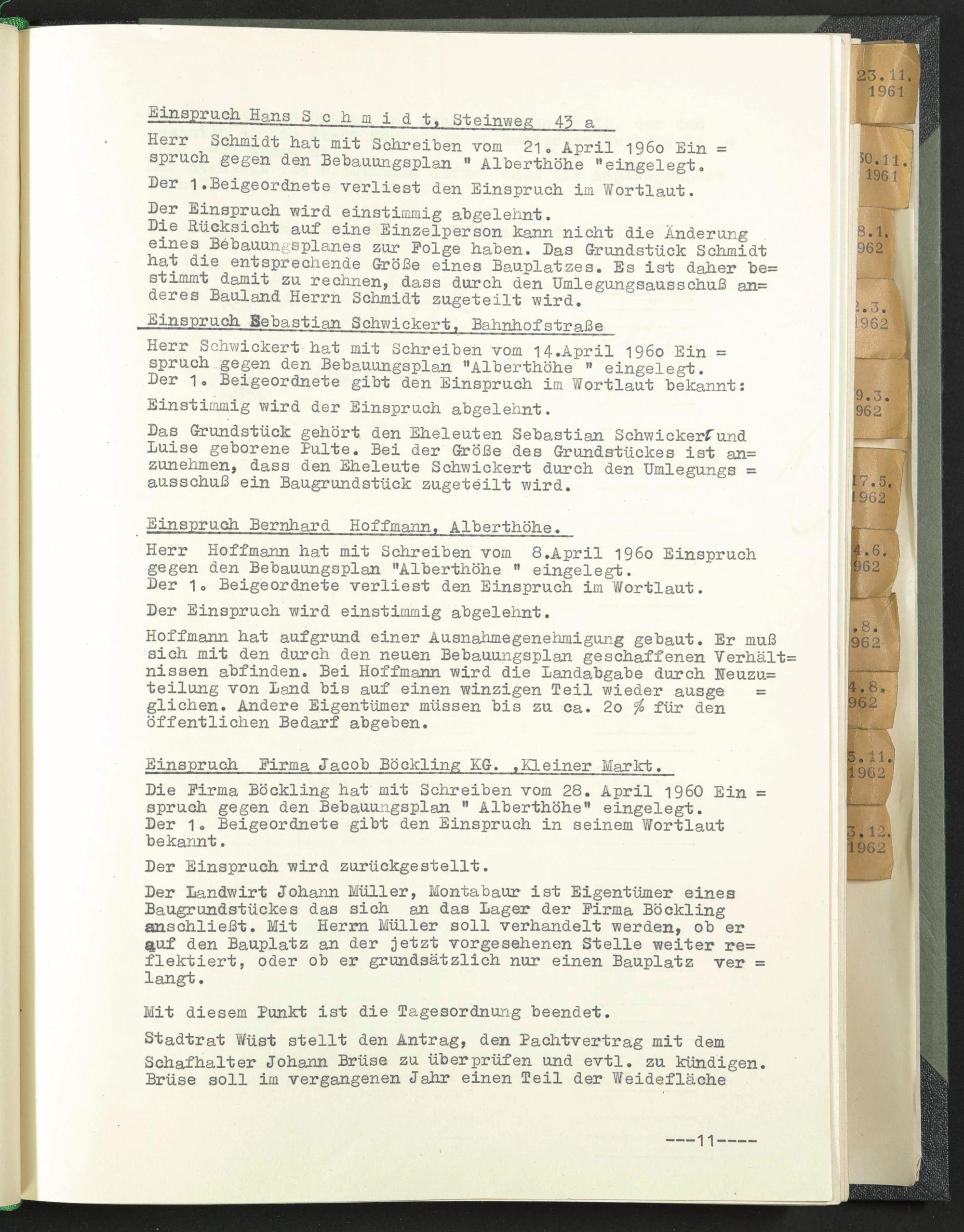 Herr Schmidt hat mit Schreiben vom 21. April 1960 Ein = sprnch gegen den Bebauungsplan " Alberthöhe "eingelegt.