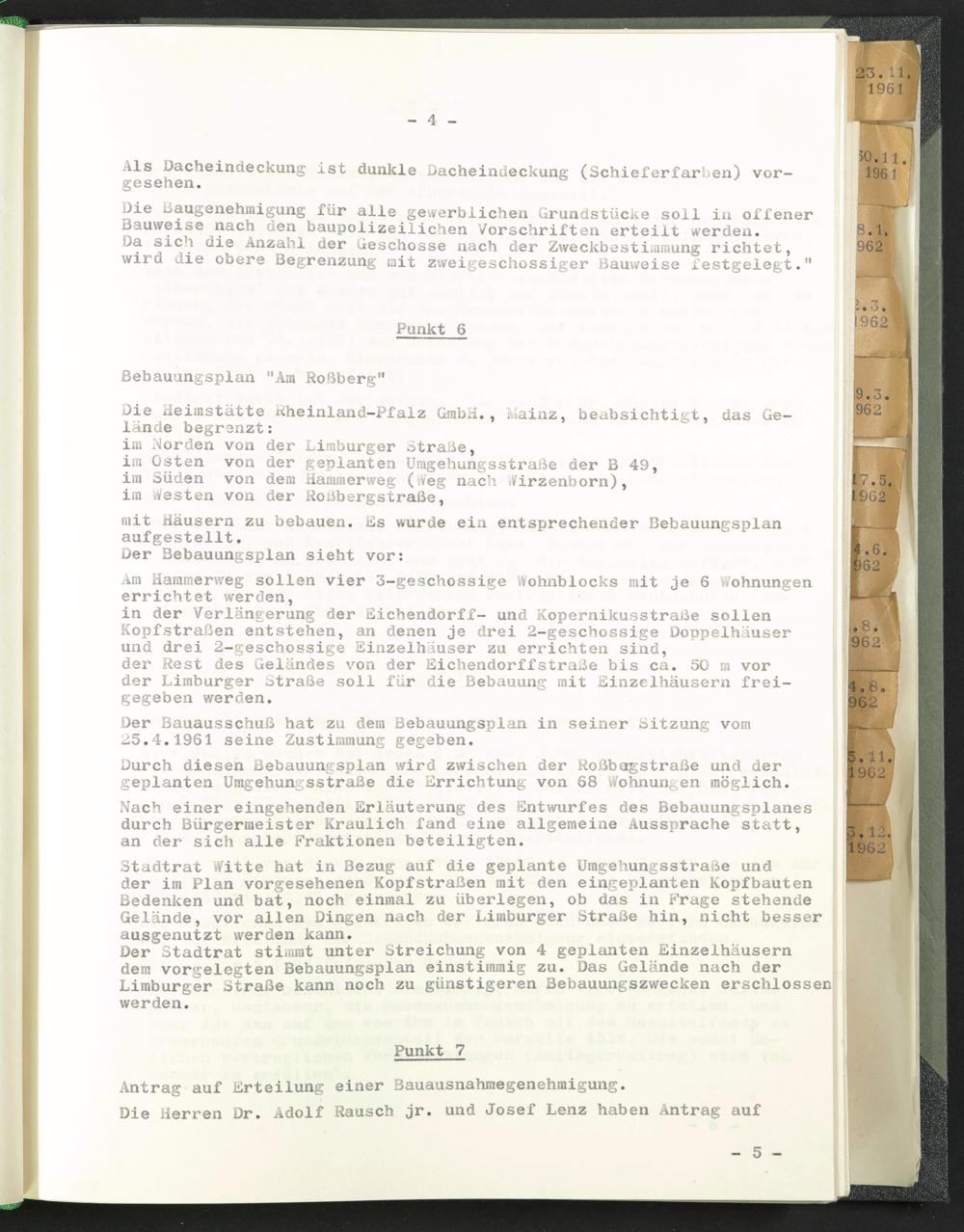 Der Stadtrat stimmt unter Streichung von 4 geplanten Einzelhäusern dem vorgelegten Bebauungsplan einstimmig zu. Das Gelände nach der Limburger Straße kann noch zu günstigeren Bebauungszwecken erschlossen werden.