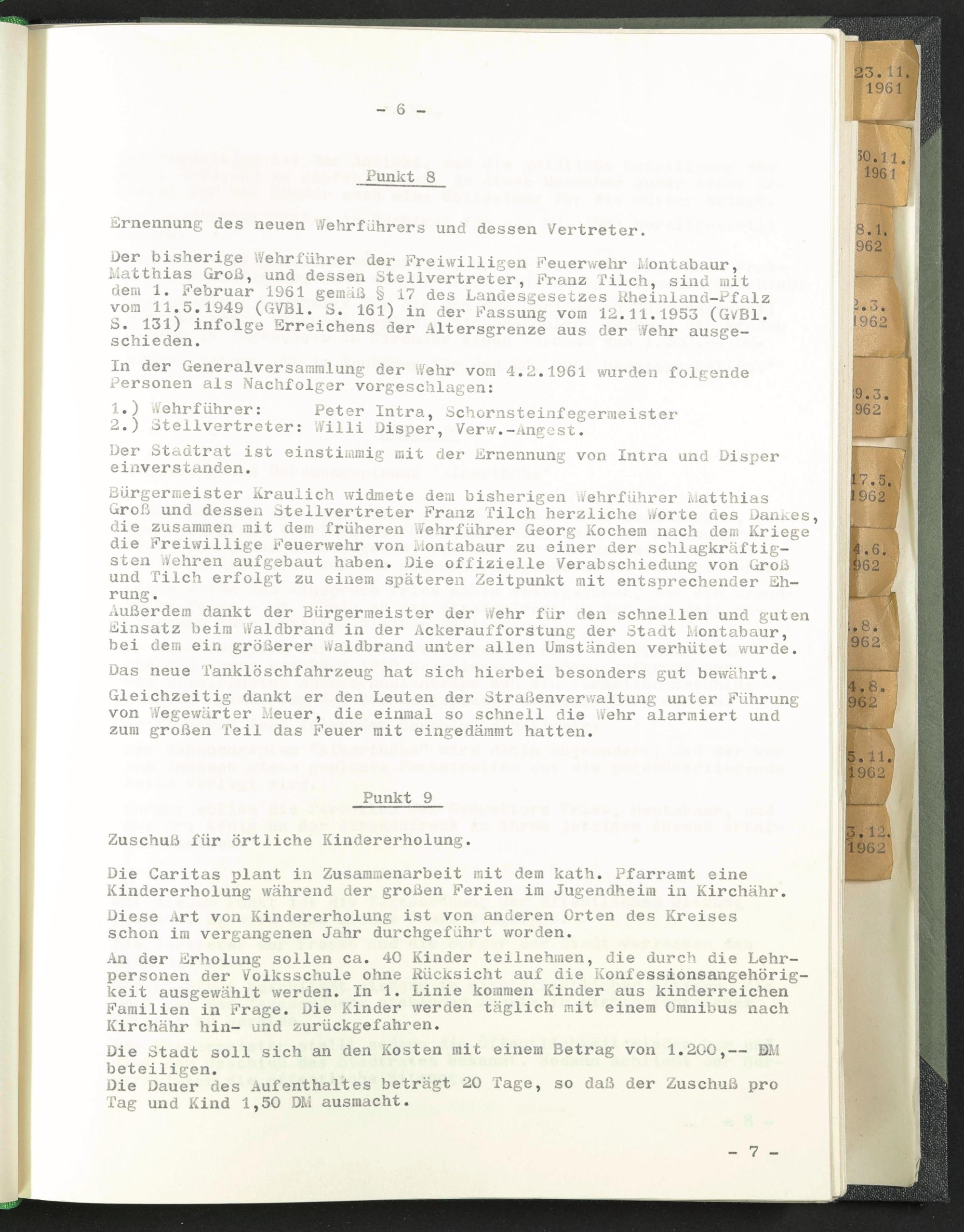 üer bisherige Wehrführer der Freiwilligen Feuerwehr Montabaur, Matthias Groß, und dessen Stellvertreter, Franz Tilch, sind mit dem 1. Februar 1961 gemäß § 17 des Landesgesetzes Rheinland-Pfalz vom 11.5.1949 (GVB1. S. 161) in der Fassung vom 12.11.1953 (GvBl.