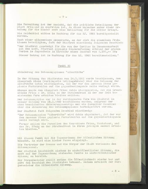In der Sitzung des Stadtrates vom 24.3.1961 wurde beschlossen, dem Einspruch Stenz (verlängerte Gehiingstraße) über die Bebauung der Alberthöhe dahin stattzugeben, daß der vor dem Anwesen Stenz geplante Parkstreifen auf die gegenüberliegende Seite verlegt würde.