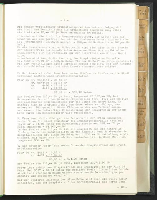 Die Abgabe vorstehender Grundstücksparzelien hat zur Folge, daß die Stadt dem Hospitaifonds die Grundstücke bezahlen muß, wobei ein Preis von 12,— DM je Rute angemessen erscheint.