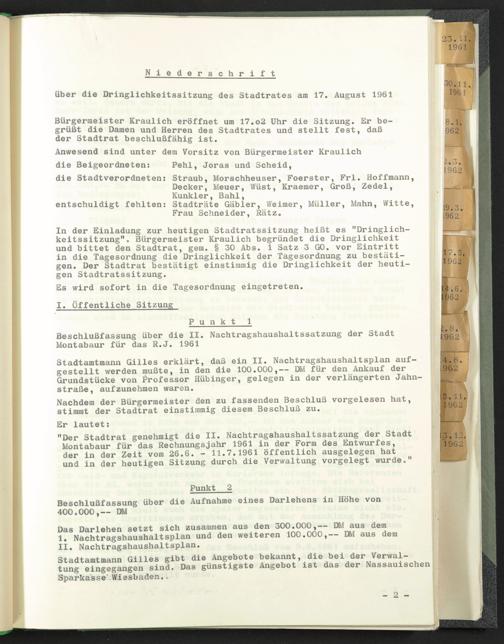 "Der Stadtrat genehmigt die II. Nachtragahaushaltssatzung der Stadt Montabaur für das Rechnungsjahr 1961 in der Form des Entwurfes, der in der Zeit vom 26.6. - 11.7.1961 öffentlich ausgelegen hat und in der heutigen Sitzung durch die Verwaltung vorgelegt wurde."