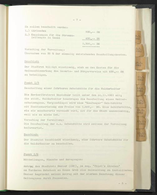 Die Revierförsterei Montabaur teilt unter dem 22.11.1961 mit; die städt. Waldarbeiter beantragen die Beschaffung eines Wetterschutzwagens. Vorgeschlagen wird eine "Kaufunger" Schutzhütte mit Zusatzausrüstung zum Preise von 1.600,— DM. Eine Schäferhütte, wie sie mancherorts verwandt wird, ist für die Stadt unzweckmäßig, weil sie zu klein ist.