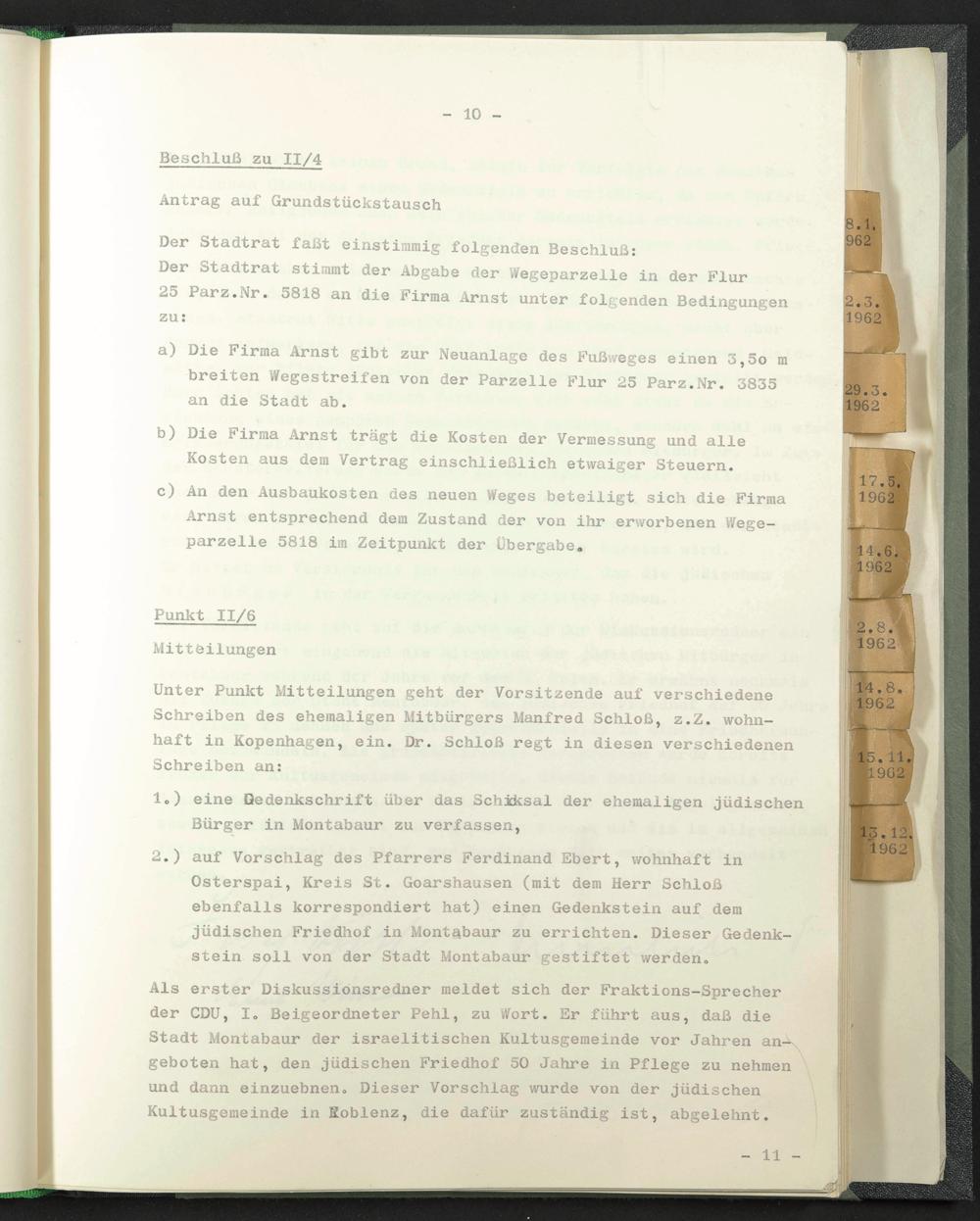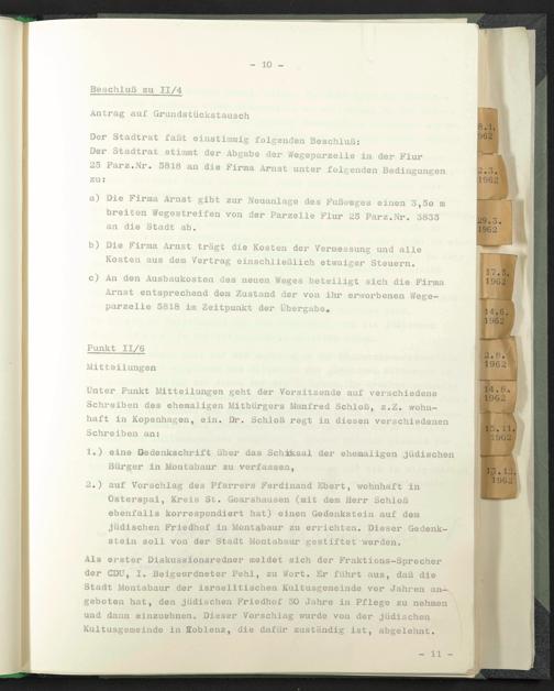 Osterspai, Kreis St. Goarshausen (mit dem Herr Schloß ebenfalls korrespondiert hat) einen Gedenkstein auf dem jüdischen Friedhof in Montabaur zu errichten. Dieser Gedenkstein soll von der Stadt Montabaur gestiftet werden.