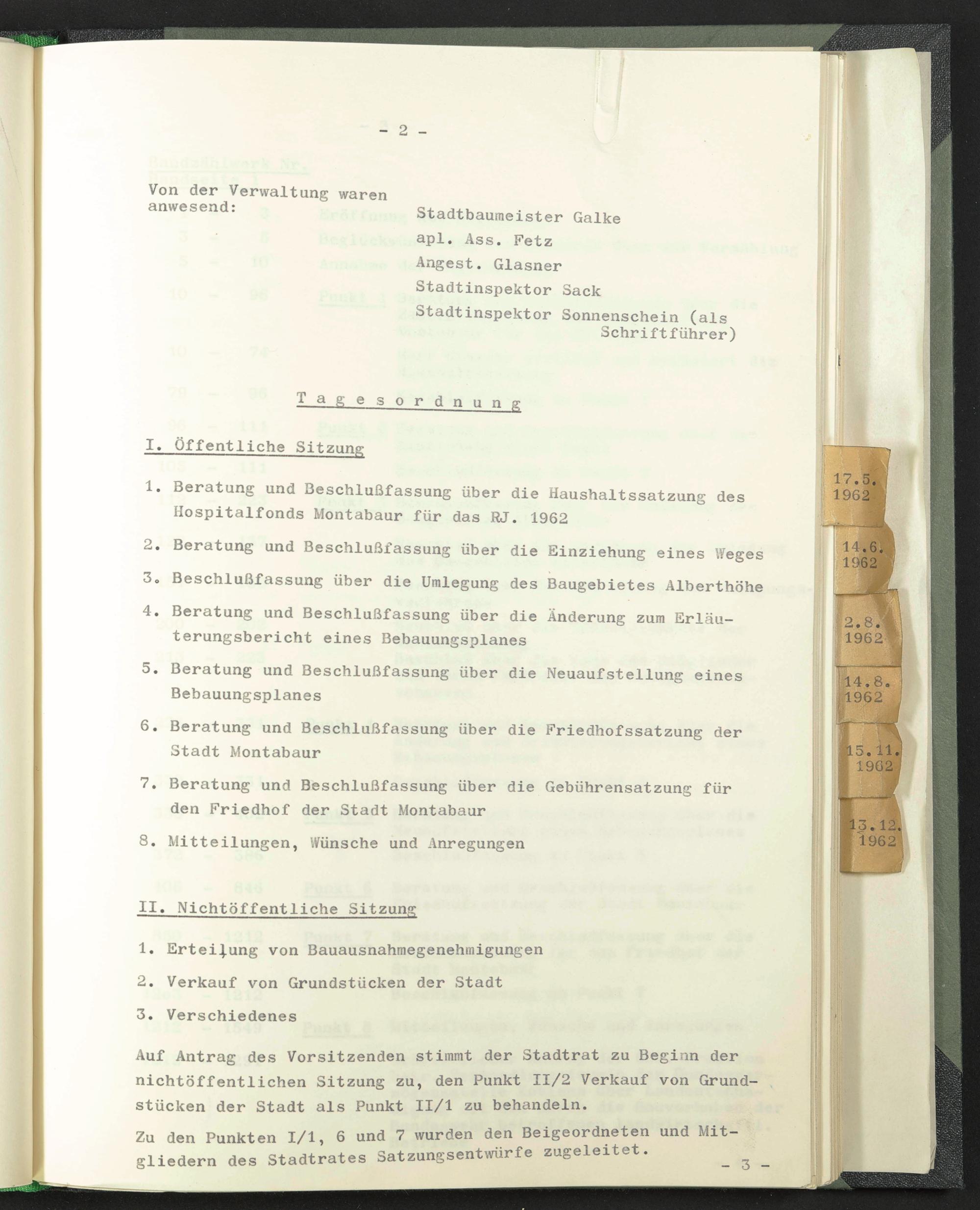 1. Beratung und Beschlußfassung über die Haushaltssatzung des Hospitalfonds Montabaur für das RJ. 1962