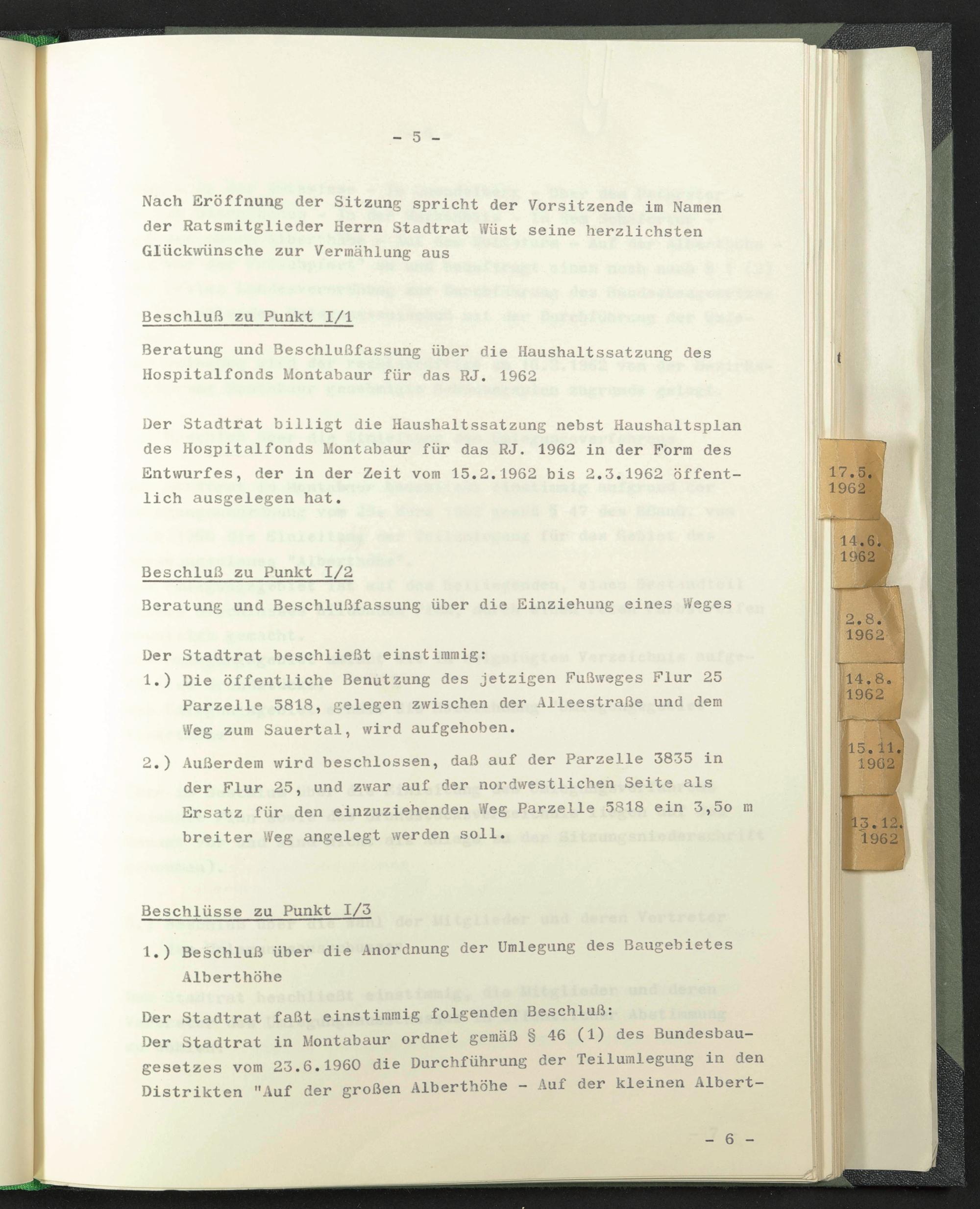 Oer Stadtrat billigt die Haushaltssatzung nebst Haushaltsplan des Hospitalfonds Montabaur für das RJ. 1962 in der Form des Entwurfes, der in der Zeit vom 15.2.1962 bis 2.3.1962 öffentlich ausgelegen hat.