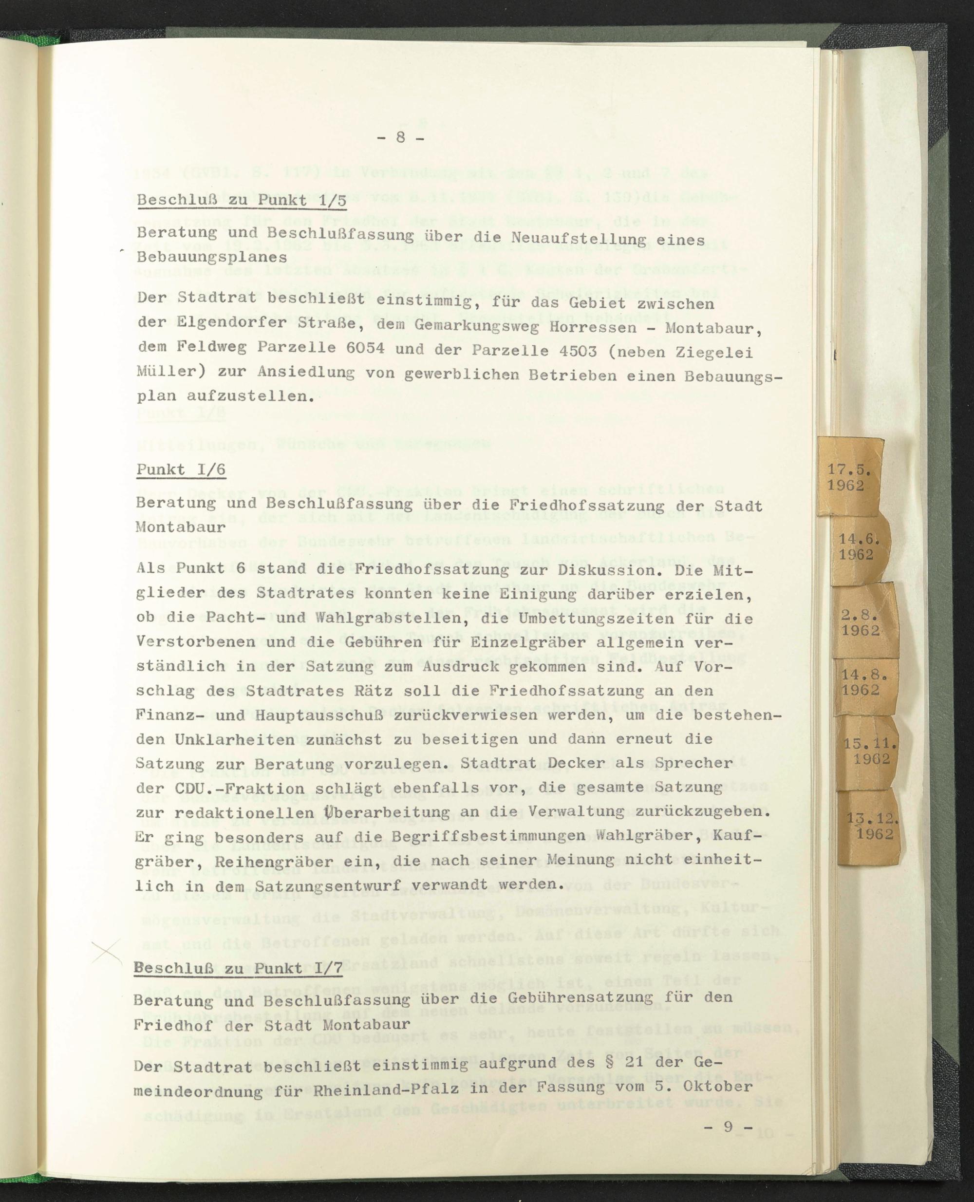 Als Punkt 6 stand die Friedhofssatzung zur Diskussion. Die Mitglieder des Stadtrates konnten keine Einigung darüber erzielen, ob die Pacht- und Wahlgrabstellen, die Umbettungszeiten für die Verstorbenen und die Gebühren für Einzelgräber allgemein verständlich in der Satzung zum Ausdruck gekommen sind. Auf Vorschlag des Stadtrates Rätz soll die Friedhofssatzung an den Finanz- und Hauptausschuß zurückverwiesen werden, um die bestehenden Unklarheiten zunächst zu beseitigen und dann erneut die Satzung zur Beratung vorzulegen. Stadtrat Decker als Sprecher der CDU.-Fraktion schlägt ebenfalls vor, die gesamte Satzung zur redaktionellen Überarbeitung an die Verwaltung zurückzugeben. Er ging besonders auf die Begriffsbestimmungen Wahlgräber, Kaufgräber, Reihengräber ein, die nach seiner Meinung nicht einheitlich in dem Satzungsentwurf verwandt werden.