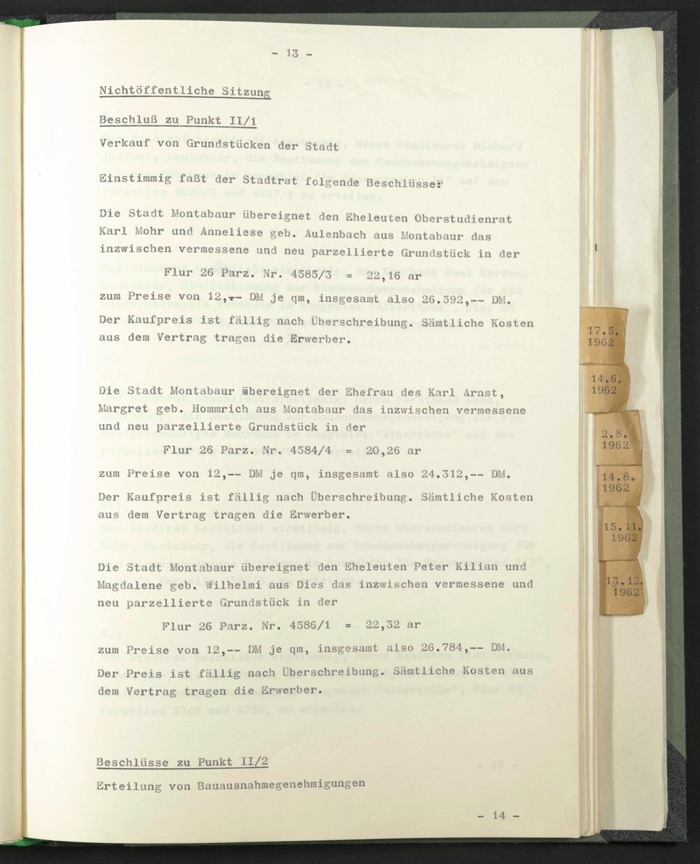 Die Stadt Montabaur übereignet den Eheleuten Oberstudienrat Karl Mohr und Anneliese geb. Aulenbach aus Montabaur das inzwischen vermessene und neu parzellierte Grundstück in der
