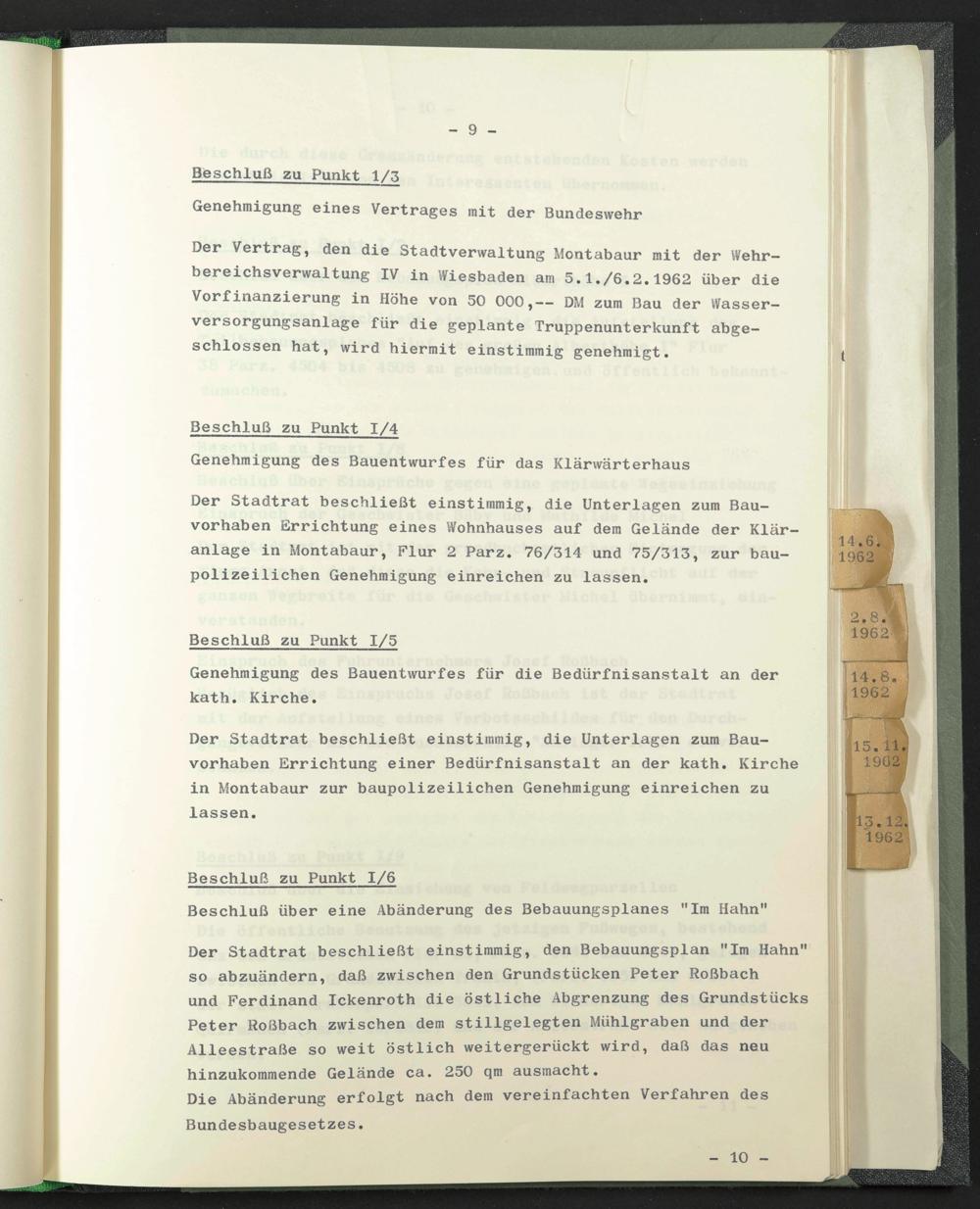 Der Vertrag, den die Stadtverwaltung Montabaur mit der Wehrbereichsverwaltung IV in Wiesbaden am 5.1./6.2.1962 über die Vorfinanzierung in Höhe von 50 000,— DM zum Bau der Wasserversorgungsanlage für die geplante Truppenunterkunft abge- schlossen hat, wird hiermit einstimmig genehmigt.