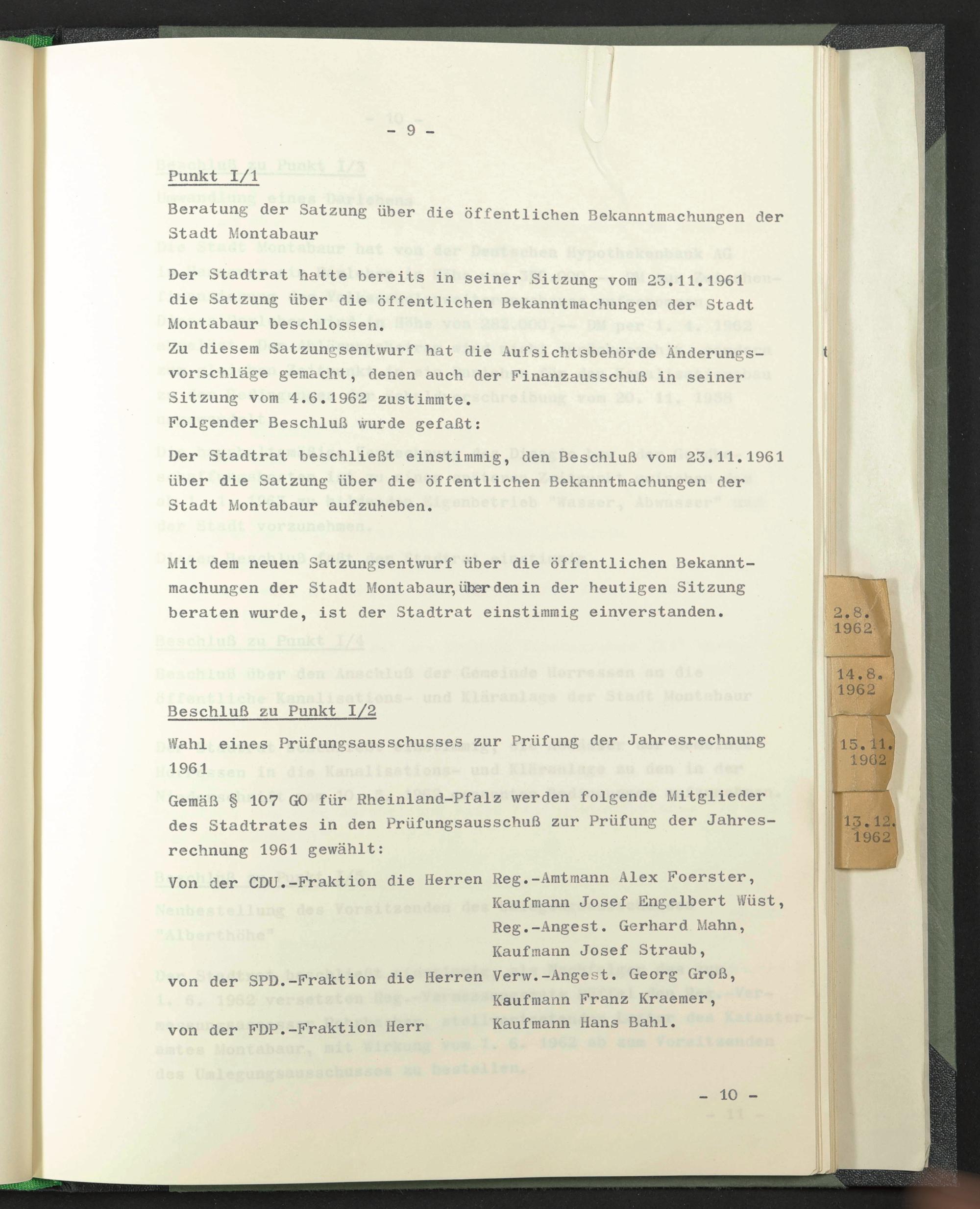 Gemäß § 107 GO für Rheinland-Pfalz werden folgende Mitglieder des Stadtrates in den Prüfungsausschuß zur Prüfung der Jahresrechnung 1961 gewählt: