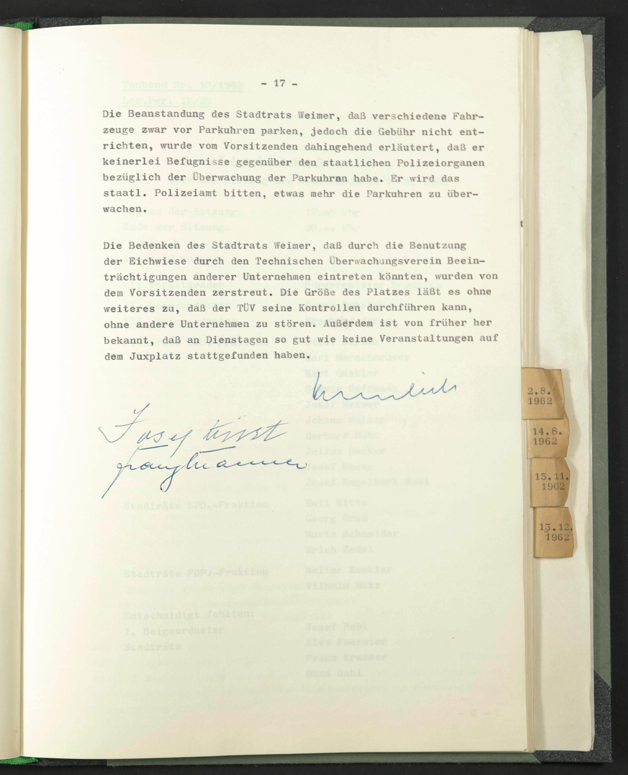 Die Bedenken des Stadtrats Weimer, daß durch die Benutzung der Eichwiese durch den Technischen Uberwachungsverein Beeinträchtigungen anderer Unternehmen eintreten könnten, wurden von dem Vorsitzenden zerstreut. Die Größe des Platzes läßt es ohne weiteres zu, daß der TüV seine Kontrollen durchführen kann, ohne andere Unternehmen zu stören. Außerdem ist von früher her bekannt, daß an Dienstagen so gut wie keine Veranstaltungen auf dem Juxplatz stattgefunden haben.