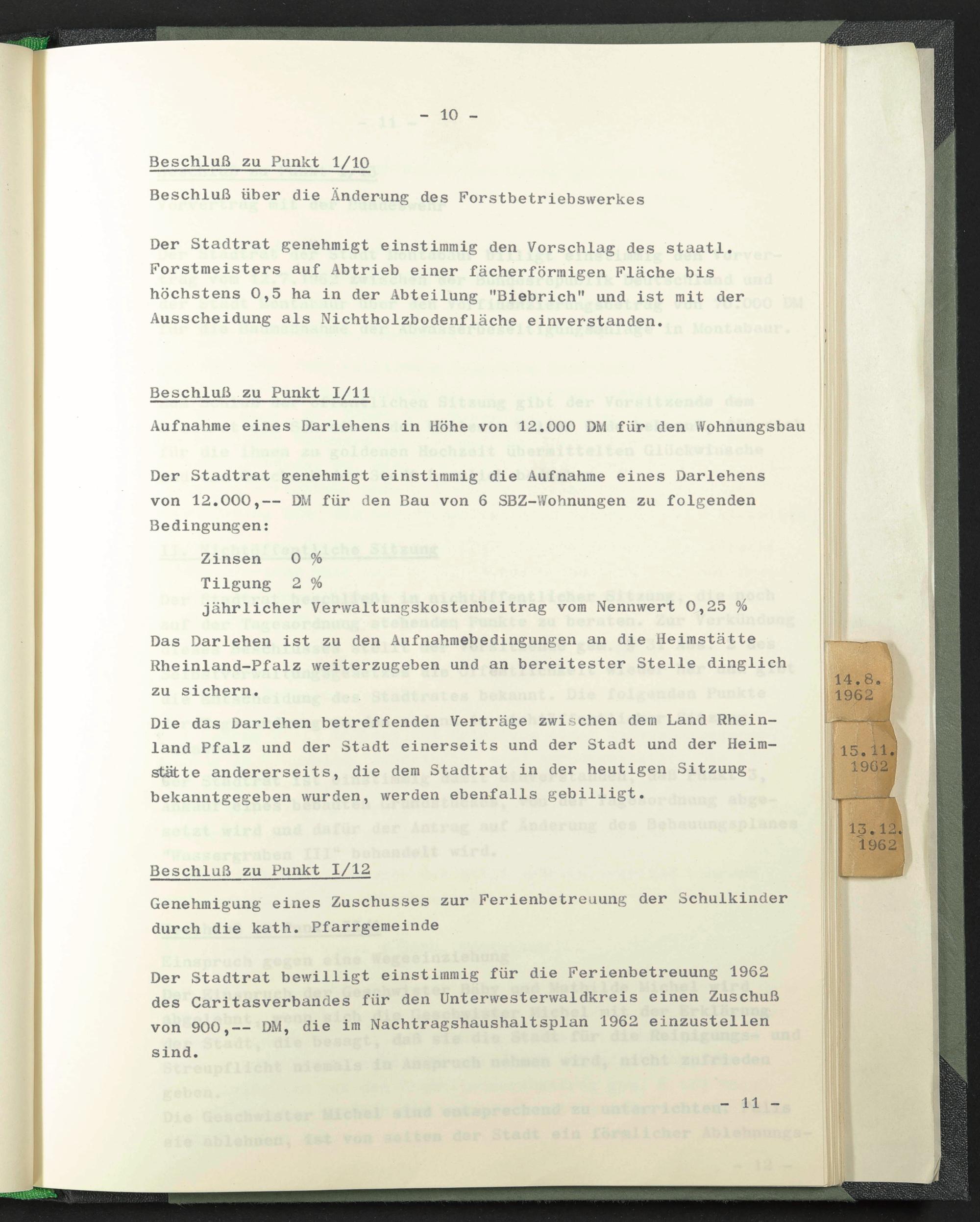 Der Stadtrat bewilligt einstimmig für die Ferienbetreuung 1962 des Caritasverbandes für den Unterwesterwaldkreis einen Zuschuß